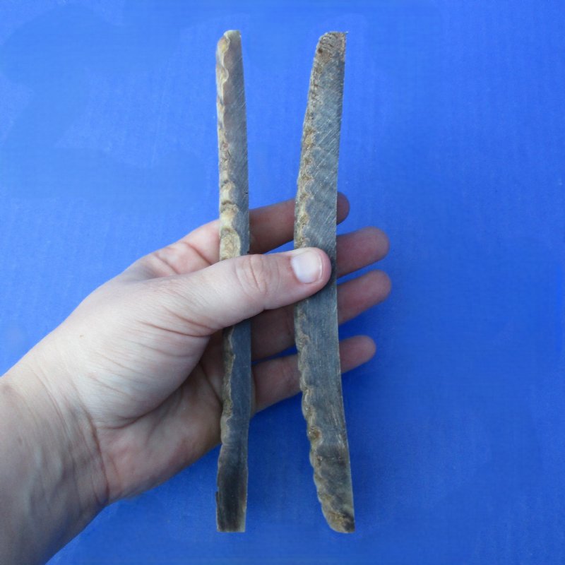 A pair of Sheep Horn Scales, or sheep horn slabs, for sale. They measure approximately 7 inches long by 1-1/4 inches wide and 1/4 inches thick. - Review all photos. Sheep horn scales are a type of knife handle material used for making optical frames, tiles for inlaid furniture, for hidden tang knives, gun grips, knife handles and for inlaid art.