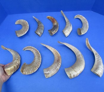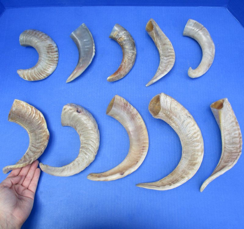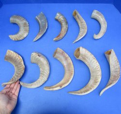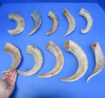10 piece lot of Polished Merino Sheep Horns (Ovis Aries) with each horn measuring 8 to 15 inches in size, measured around the curl of the horn - not straight - using a cloth tape measure. These sheep horns will have natural imperfections including, gouges, holes, splits, missing sections of top layer, etc. from aging and fighting. Some parts of the horn are polished to a smooth shine while other parts are polished and the natural ridges are visible and can be felt - Review photos. Our horns are a by-product of the farming industry and Government culling programs and are imported from India and South Africa.