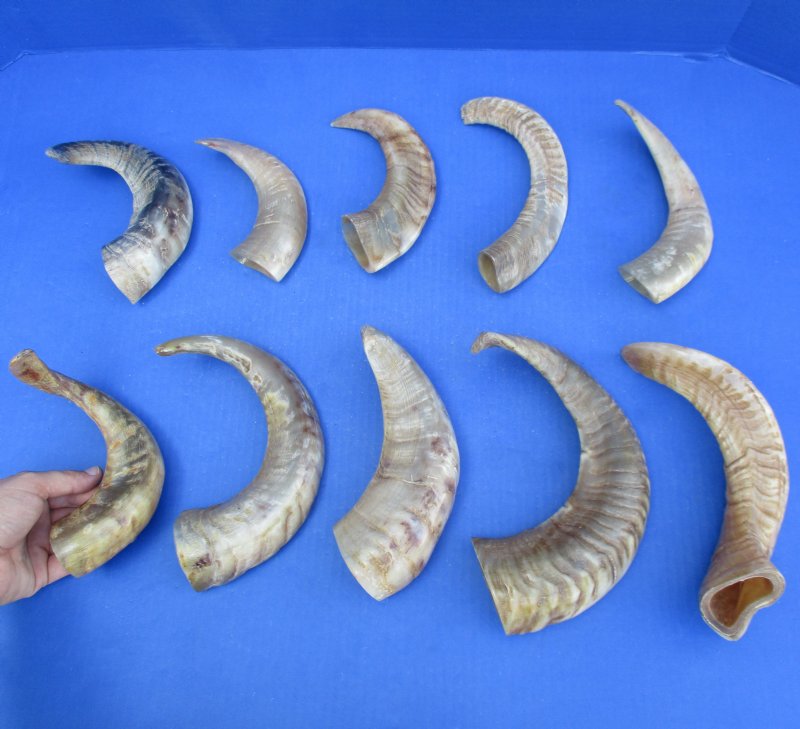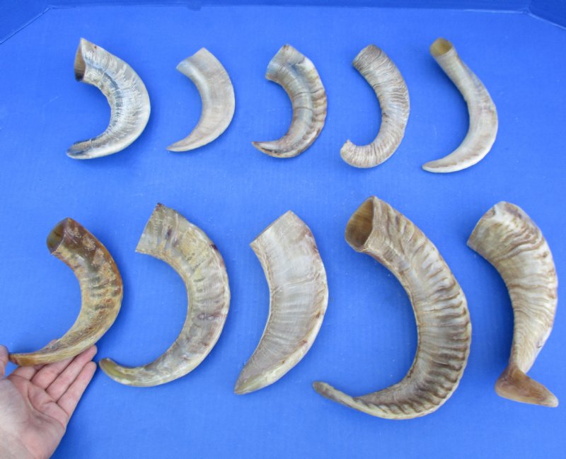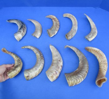 10 piece lot of Polished Merino Sheep Horns (Ovis Aries) with each horn measuring 8 to 16 inches in size, measured around the curl of the horn - not straight - using a cloth tape measure. These sheep horns will have natural imperfections including, gouges, holes, splits, missing sections of top layer, etc. from aging and fighting. Some parts of the horn are polished to a smooth shine while other parts are polished and the natural ridges are visible and can be felt - Review photos.