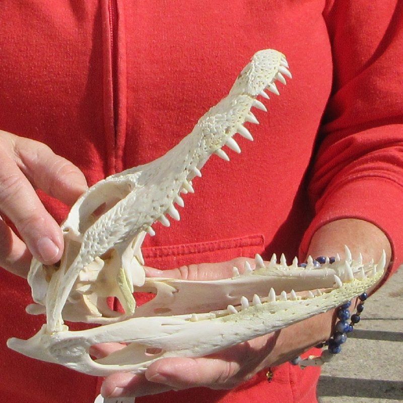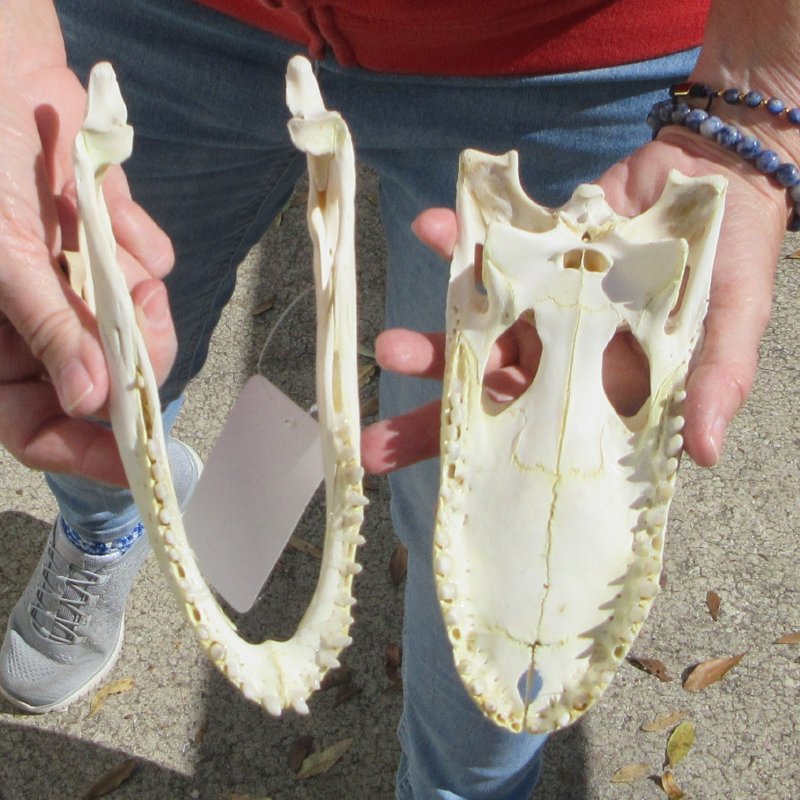 B-Grade Florida Alligator Skull (Alligator mississippiensis) measuring approximately 8-3/4 inches long and 3-1/2 inches wide and is from an estimated 4 foot Florida alligator.  - Missing teeth and yellow tint on some parts to skull.  Review all photos. The alligator skull has been cleaned and whitened.  It is a real gator skull - NOT a replica, and will have some natural blemishes, cartilage and chipped or missing teeth from living in the wild and fighting.