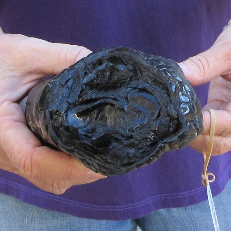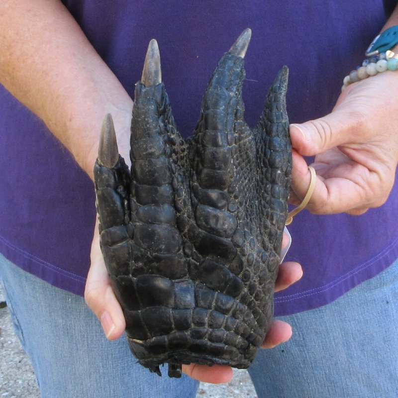 Preserved Alligator Foot, measuring approximately 8-3/4 inches in length. The ends of the foot have been rough cut and painted black Review all photos. This alligator foot will have an odor from the preservation process that will subside over time. This is a Real Gator Foot - Not a Replica. It will have natural imperfections. These alligator feet come from gator farms where the gators are harvested for their meat and hide.