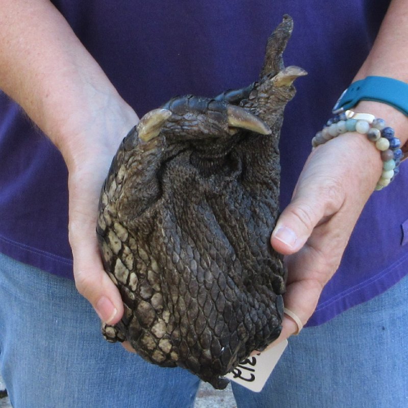 Preserved Alligator Foot, measuring approximately 8 inches in length. The ends of the foot have been rough cut and painted black Review all photos. This alligator foot will have an odor from the preservation process that will subside over time. This is a Real Gator Foot - Not a Replica. It will have natural imperfections. These alligator feet come from gator farms where the gators are harvested for their meat and hide.