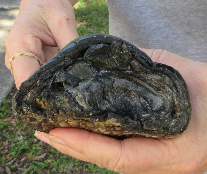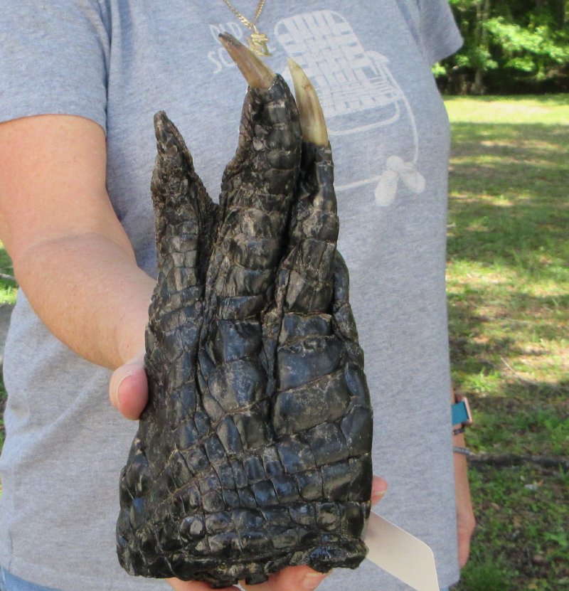Genuine Preserved Alligator Foot, measuring approximately 8 inches in length. The ends of the foot have been rough cut and finished with black paint for a clean, display-ready look.  Review all photos. Please note that due to the preservation process, a slight scent may be present upon arrival; this is normal and will naturally subside over time once displayed in a well-ventilated area. This is a Real Gator Foot - Not a Replica. It will have natural imperfections. These alligator feet come from gator farms where the gators are harvested for their meat and hide.  Ideal for Oddity collections, rustic cabin decor, educational specimens or unique conversation pieces.