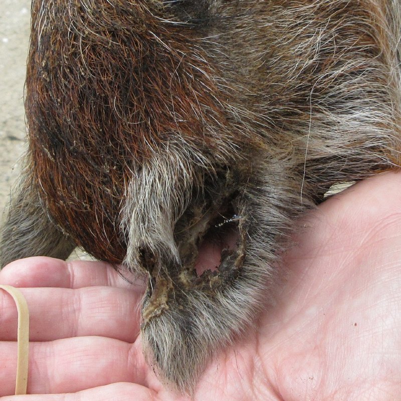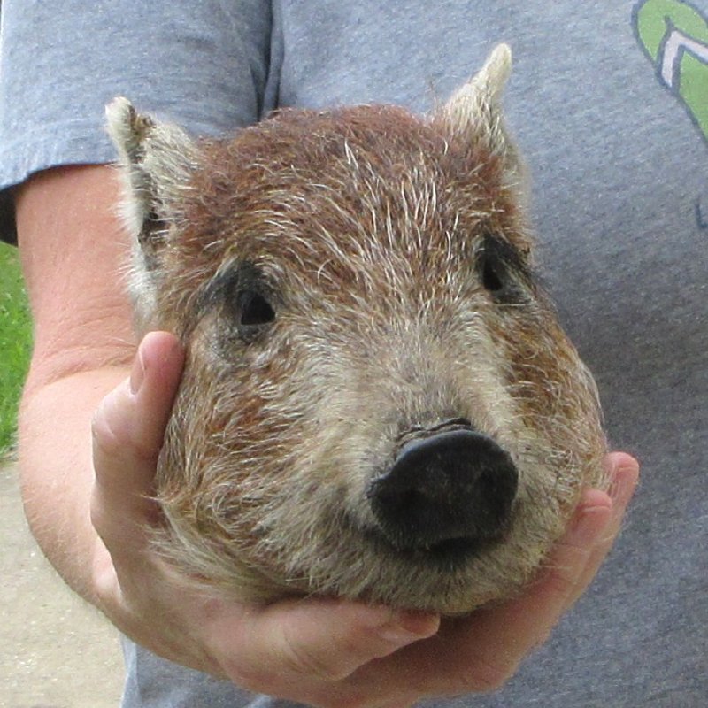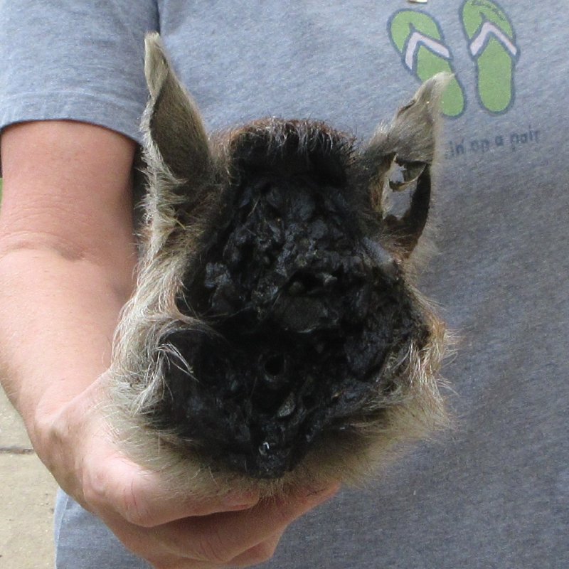 Real Preserved Georgia Wild Boar, Hog/Pig Head. This preserved wild boar measures approximately 8 inches long.  It will have a slight odor from the preservation process that will subside over time. It is Real - Not a Replica. Hole in ear.  The back of the head has been rough cut and painted black.