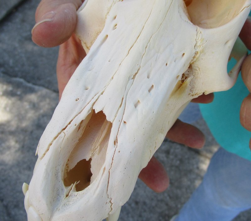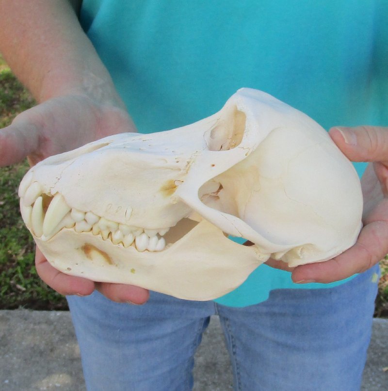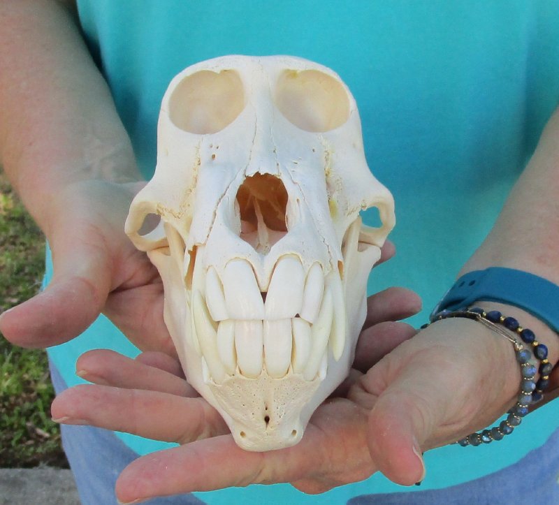 All of our baboon skulls are commercial grade and imperfect.  They will have imperfections due to the natural aging process and living in the wild--scars, blemishes, broken/missing teeth, etc.  This baboon skull was professionally cleaned and cleared by the U.S Fish and Wildlife Services and U.S Customs Services for legal entry into the United States.