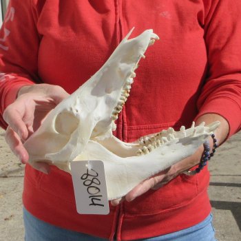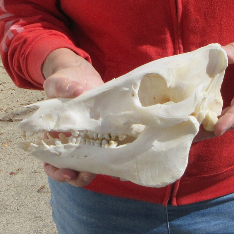 This is a Wild boar skull, wild pig skull measuring approximately 9-1/2 inches long and 4 inches wide. These boar skulls are commercial grade and will have broken and missing teeth, excessive glue and oily -  Review all photos. This wild boar skull, wild pig skull, has been cleaned (but not whitened) and is ready for display. Wild boar skulls are perfect for skull collectors and collectors of weird and unusual items.