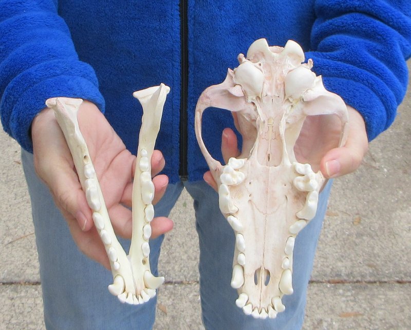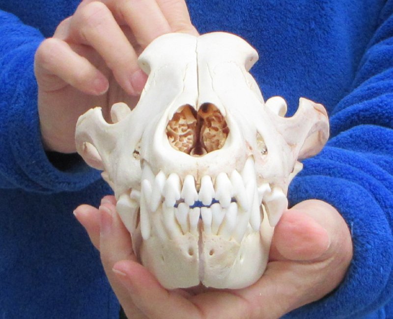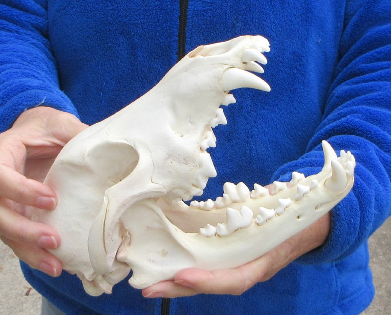 Gray Wolf Skull (Canis Lupis) from Alaska measuring approximately 9-1/4 inches long and 5 inches wide.  This Gray Wolf Skull has been cleaned and is ready for display.  Discolored (pinkish tint on parts of the skull) - Review photos. This is the largest extant member of the family Canidae, and is further distinguished from other Canis species by its less pointed ears and muzzle, as well as a shorter torso and a longer tail.  The wolf is nonetheless related closely enough to smaller Canis species, such as the coyote and the golden jackal, to produce fertile hybrids with them. Their fur is usually mottled white, brown, gray and black, although subspecies in the arctic region may be nearly all white.