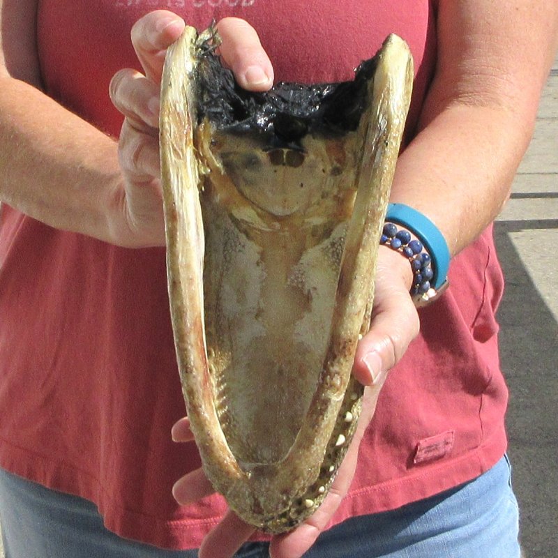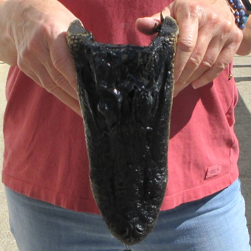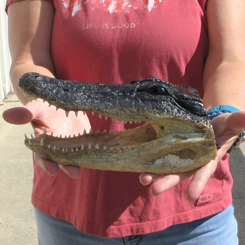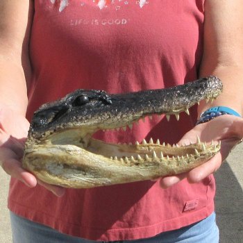 This alligator head measures approximately 9 inches long. This is a real alligator head -- NOT a replica. It will have missing and worn teeth, cuts, scrapes and scars -- Review all photos.  Alligator head souvenirs are a profitable retail product for beach shops, souvenir and gift stores catering to gator football fans, tourists, reptile collectors, teachers, students, and collectors of unusual items.  A taxidermy process cures the alligator skin and the alligator skull so it will be preserved for years.  These gator heads come from gator farms who harvest the gators for their meat and hide.
