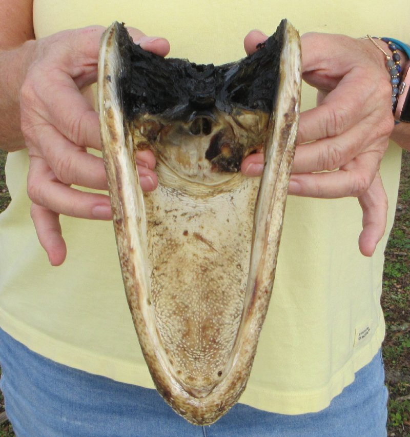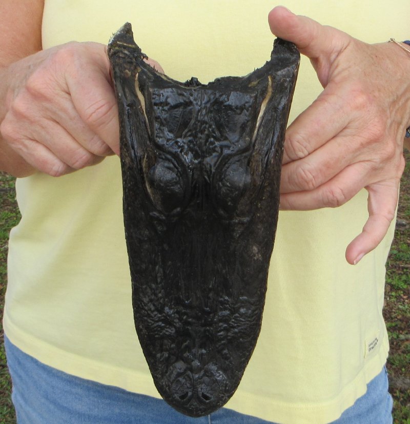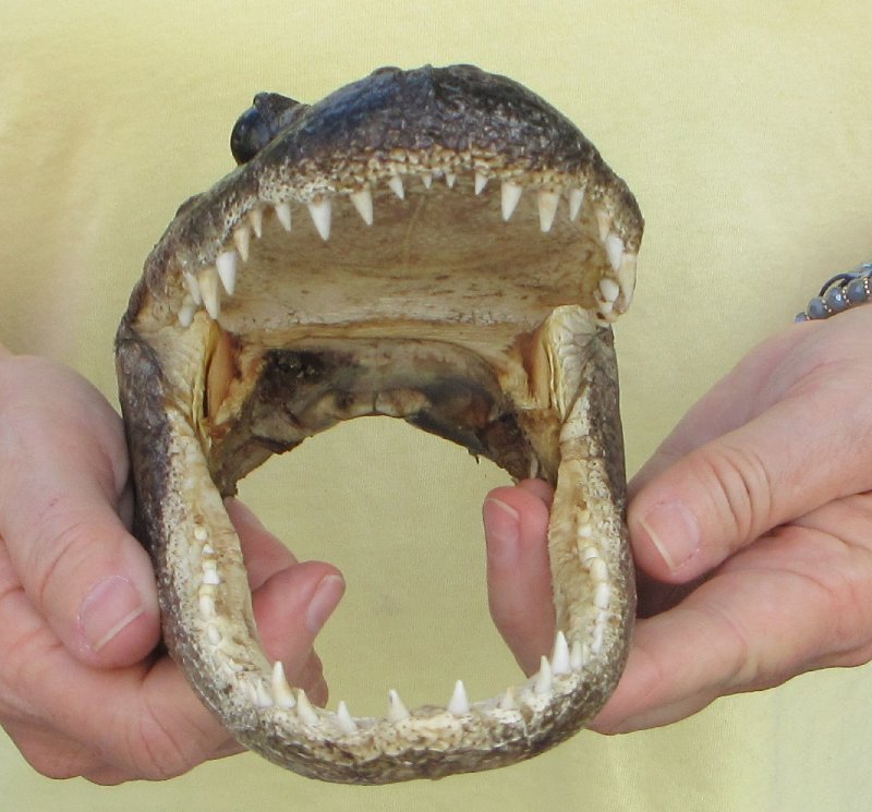 This alligator head measures approximately 9 inches long. This is a real alligator head -- NOT a replica. It will have missing and worn teeth, cuts, scrapes and scars -- Review all photos. Alligator head souvenirs are a profitable retail product for beach shops, souvenir and gift stores catering to gator football fans, tourists, reptile collectors, teachers, students, and collectors of unusual items. A taxidermy process cures the alligator skin and the alligator skull so it will be preserved for years. These gator heads come from gator farms who harvest the gators for their meat and hide.