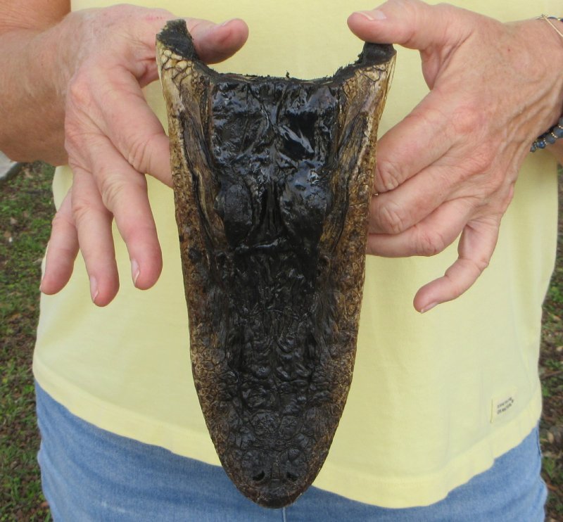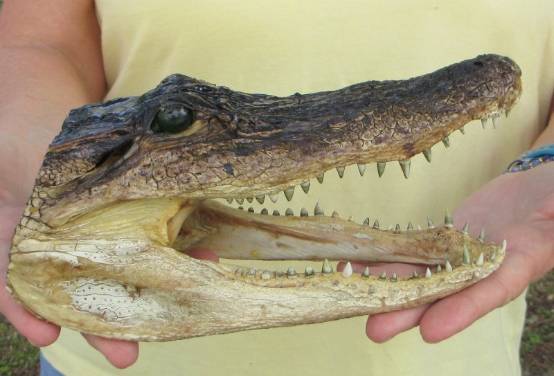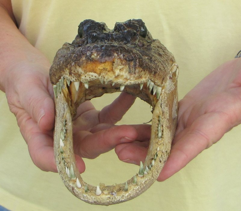 This alligator head measures approximately 9 inches long. This is a real alligator head -- NOT a replica. It will have missing and worn teeth, cuts, scrapes and scars -- Review all photos.  Alligator head souvenirs are a profitable retail product for beach shops, souvenir and gift stores catering to gator football fans, tourists, reptile collectors, teachers, students, and collectors of unusual items.  A taxidermy process cures the alligator skin and the alligator skull so it will be preserved for years.  These gator heads come from gator farms who harvest the gators for their meat and hide.
