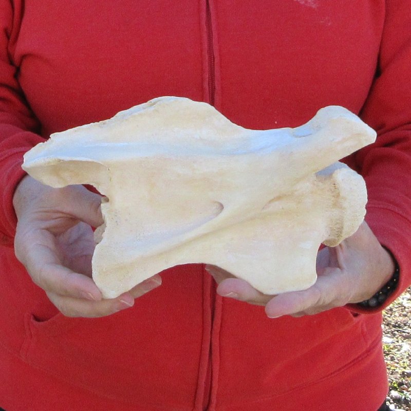 Small Giraffe Neck Vertebra Bone (Giraffa camelopardalis) for sale measuring approximately 9 inches long and 5 inches wide.  Review all photos. This giraffe vertebra bone is from a real African Giraffe's neck and will have some stains and natural imperfections normally found on all wild animal bones.