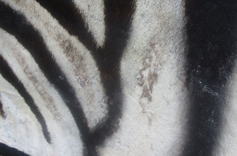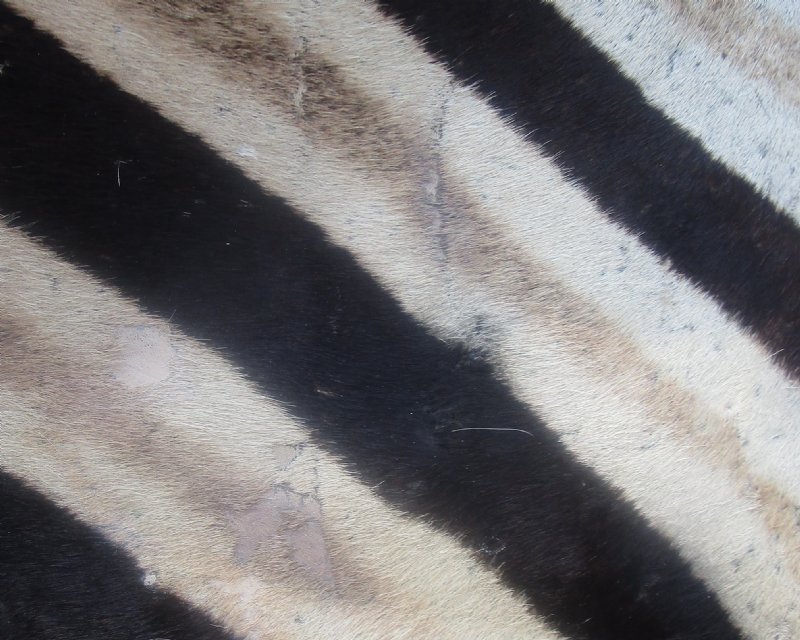 C-Grade Real African zebra skin (Equus burchelli) rug for sale, zebra skin area rug imported from South Africa. This is a real African zebra skin area rug lined with a black felt backing and measures approximately 97 inches long from base of the tail to the nose by 63 inches wide measured at widest point on back legs.  All zebra skins will have small imperfections from the zebra living in the wild. These skins may have patches, bald spots, repair stitching, and other small imperfections - review photos. Our real zebra skin area rugs are professionally tanned in South Africa. This zebra skin was harvested in accordance with the African government's culling program.