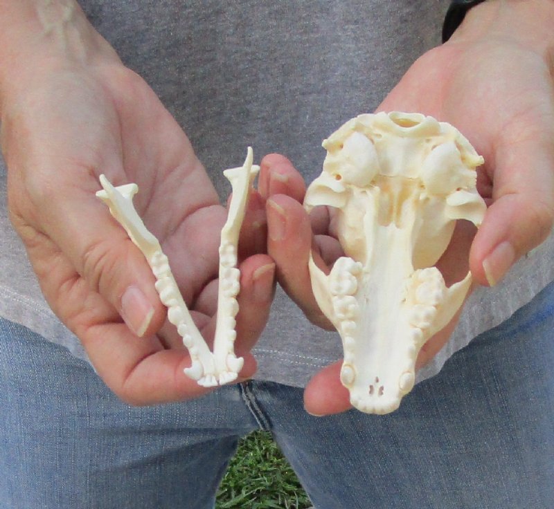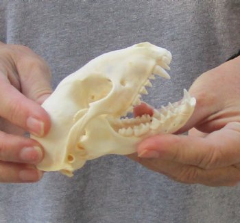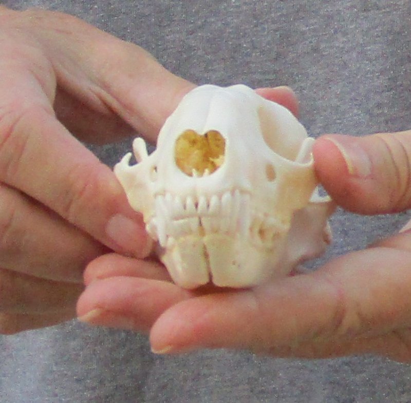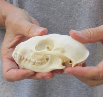 A-Grade Raccoon skull, small animal skull measuring approximately 4-1/4 inches long and 2-1/2 inches wide.    Review all photos.  The raccoon skull is a small animal skull from a wild raccoon and will have natural imperfections found on all wild animal skulls. Our raccoon skulls have been cleaned, however some will have a golden color or will have patches of light yellow.