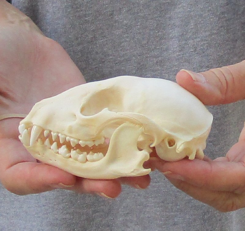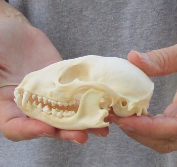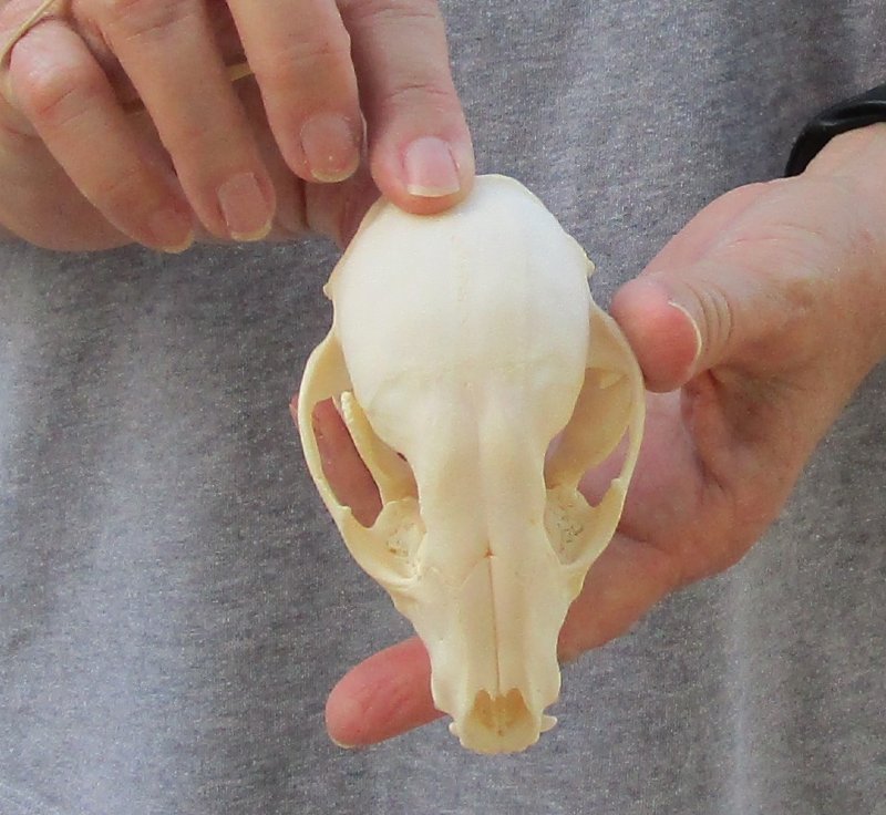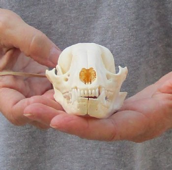A-Grade Raccoon skull, small animal skull measuring approximately 4-1/4 inches long and 2-1/2 inches wide.    Review all photos.  The raccoon skull is a small animal skull from a wild raccoon and will have natural imperfections found on all wild animal skulls. Our raccoon skulls have been cleaned, however some will have a golden color or will have patches of light yellow.