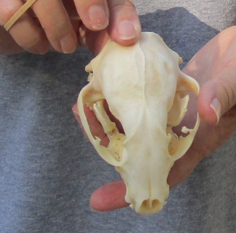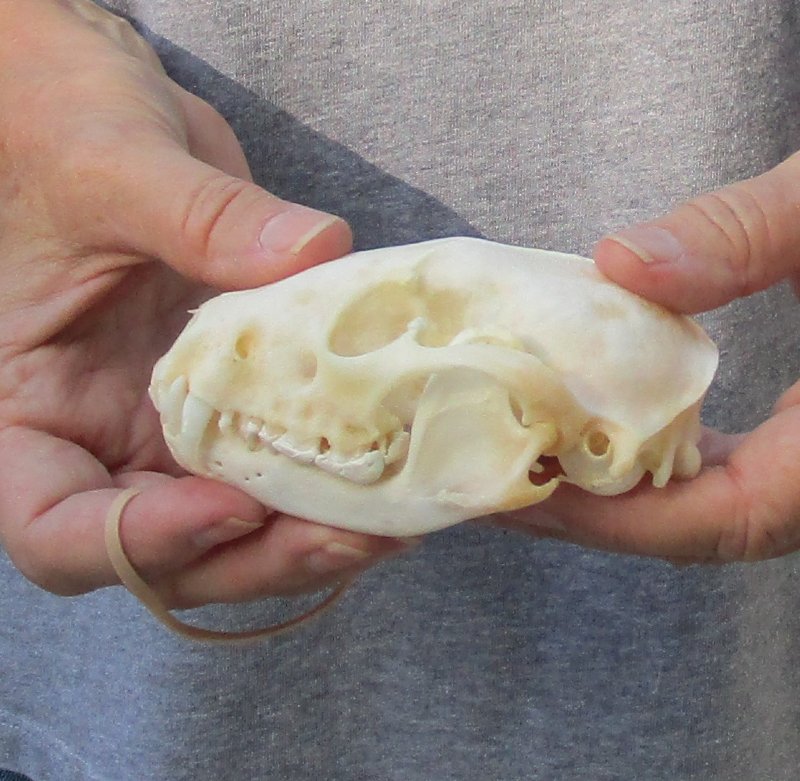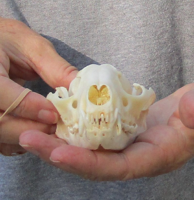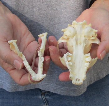 A-Grade Raccoon skull, small animal skull measuring approximately 4 inches long and 2-3/4 inches wide.    Review all photos.  The raccoon skull is a small animal skull from a wild raccoon and will have natural imperfections found on all wild animal skulls. Our raccoon skulls have been cleaned, however some will have a golden color or will have patches of light yellow.