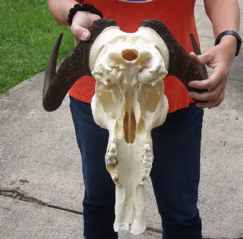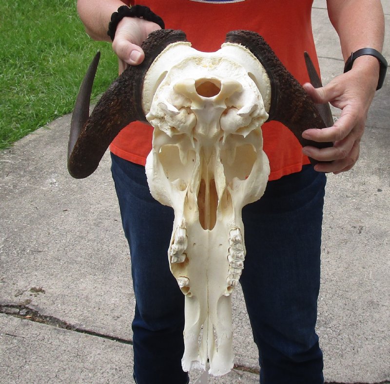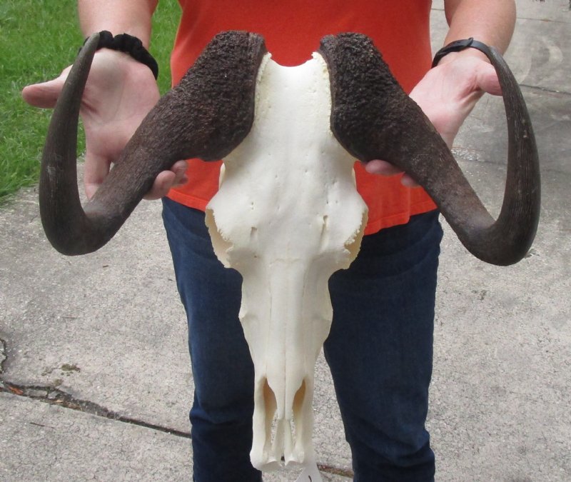 African black female wildebeest skull with horns, Connochaetes gnau will add a natural element to your rustic cabin or hunting lodge. This female black wildebeest skull with horns has a horn spread of approximately 15 inches wide and the skull is approximately 15 inches long.  Missing a few teeth -review photos. This is a real black wildebeest skull with horns and will have imperfections caused by the animal living in the wild and fighting.