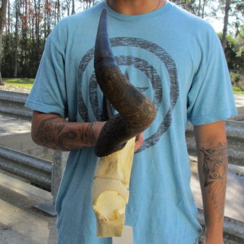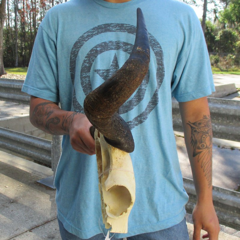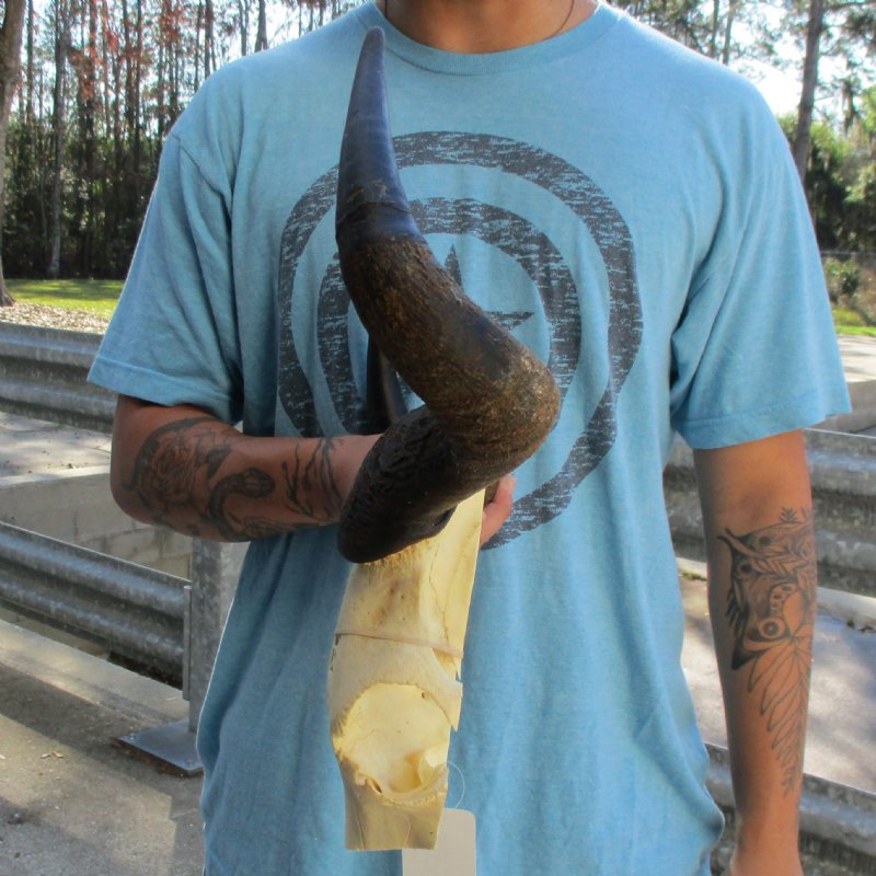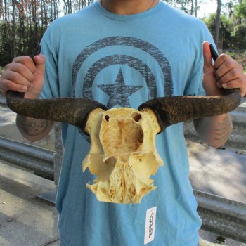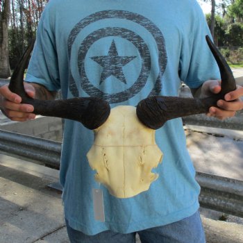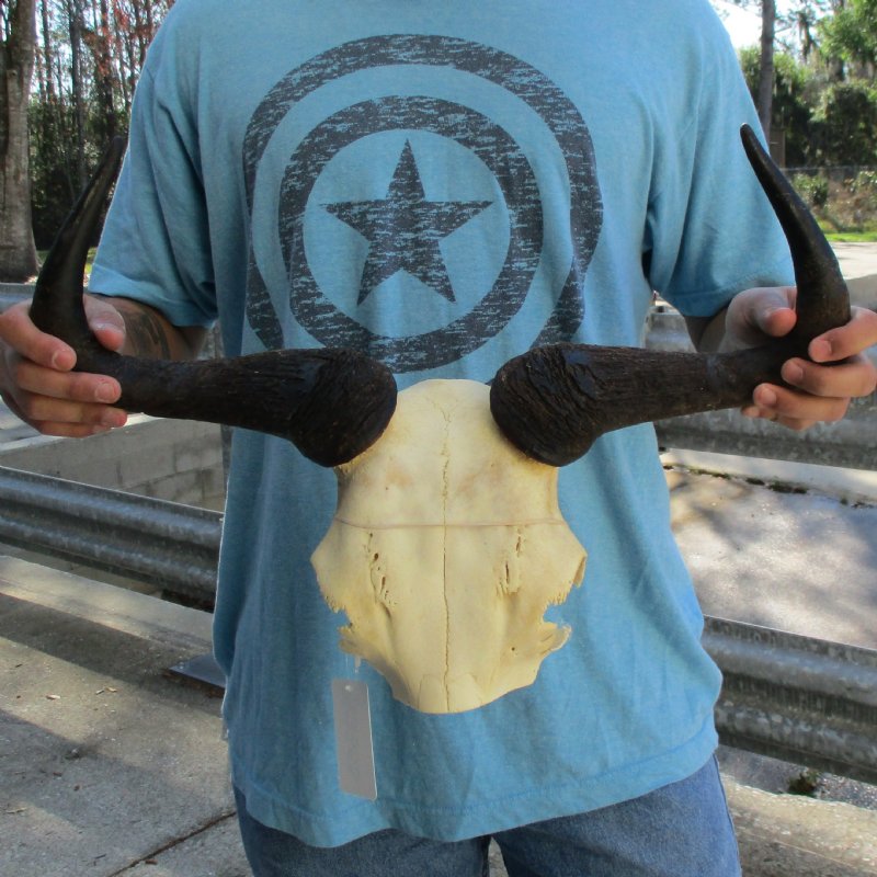 African Blue Wildebeest Skull Plate (Connochaetes gnau) for sale. This blue wildebeest skull plate with horns has a horn spread of approximately 19 inches wide. - Review all photos. This is a real blue wildebeest skull plate with horns and will have imperfections caused by the animal living in the wild and fighting, such as cracks, holes, blemishes, rub areas, etc. All of our wildebeest skull plates with horns are by-products of the African Government's culling program and farming industry. All products were professionally cleaned in South Africa and cleared by the U.S Fish and Wildlife Services and U.S. Customs Services for legal entry into the United States.