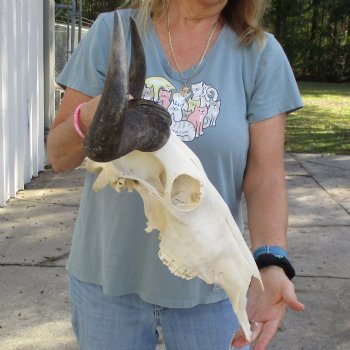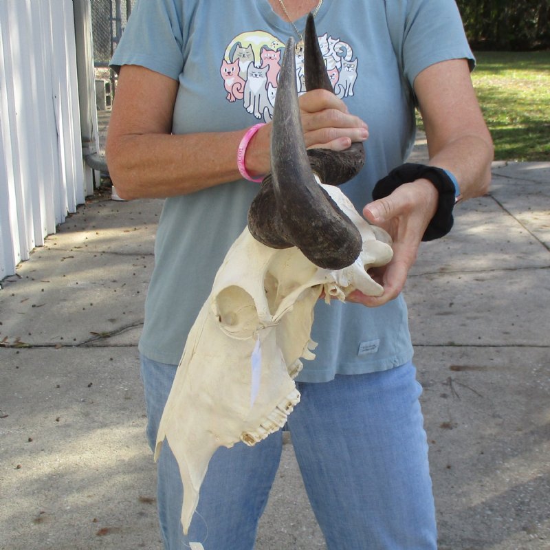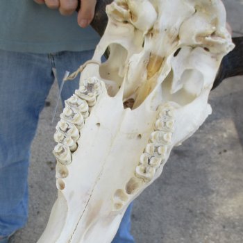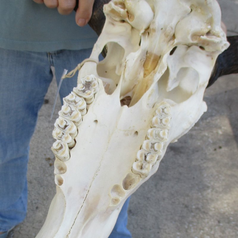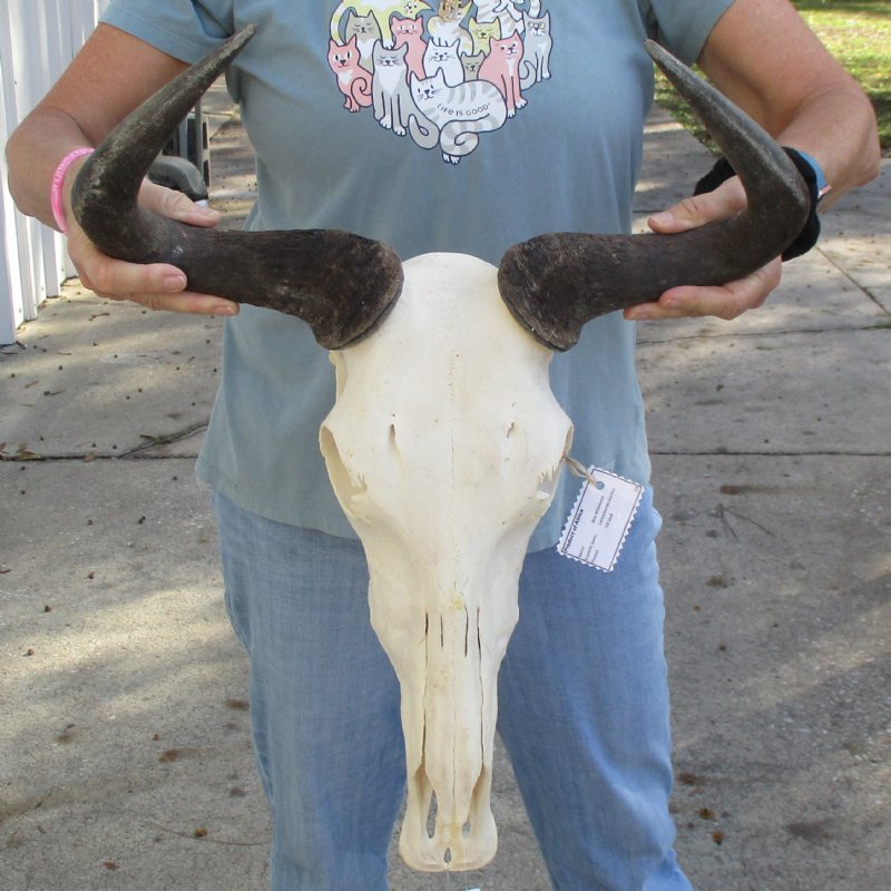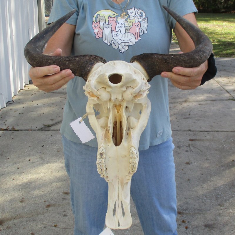 African Blue Wildebeest Skull (Connochaetes gnau) for sale. This blue wildebeest skull with horns has a horn spread of approximately 18 inches wide and the skull is approximately 17 inches long. Some teeth missing. - Review all photos. This is a real blue wildebeest skull with horns and will have imperfections caused by the animal living in the wild and fighting, such as cracks, holes, blemishes, rub areas, broken or missing teeth, etc. All of our wildebeest skulls with horns are by-products of the African Government's culling program and farming industry. All products were professionally cleaned in South Africa and cleared by the U.S Fish and Wildlife Services and U.S. Customs Services for legal entry into the United States.
