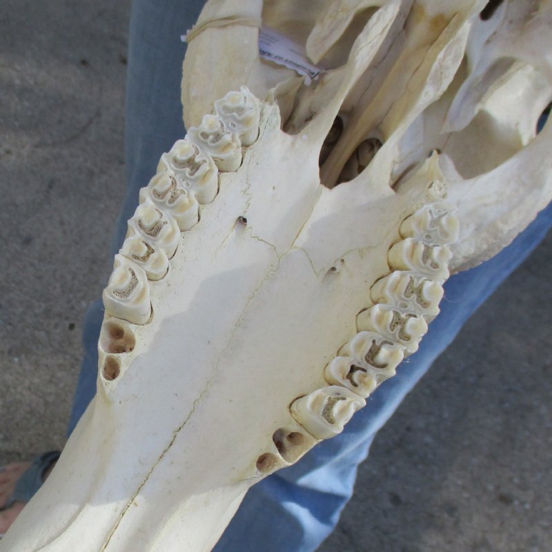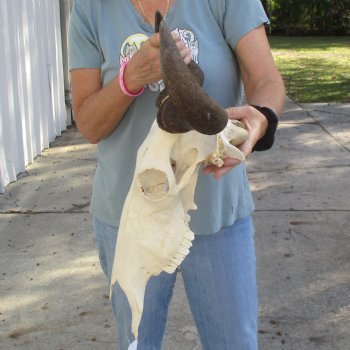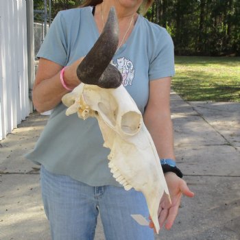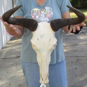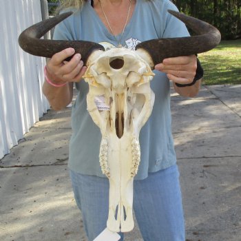 African Blue Wildebeest Skull (Connochaetes gnau) for sale. This blue wildebeest skull with horns has a horn spread of approximately 20 inches wide and the skull is approximately 18-1/2 inches long. Some teeth missing and blue discoloration on skull. - Review all photos. This is a real blue wildebeest skull with horns and will have imperfections caused by the animal living in the wild and fighting, such as cracks, holes, blemishes, rub areas, broken or missing teeth, etc. All of our wildebeest skulls with horns are by-products of the African Government's culling program and farming industry. All products were professionally cleaned in South Africa and cleared by the U.S Fish and Wildlife Services and U.S. Customs Services for legal entry into the United States.