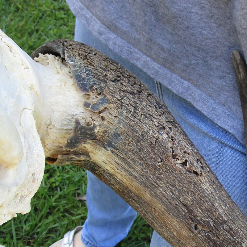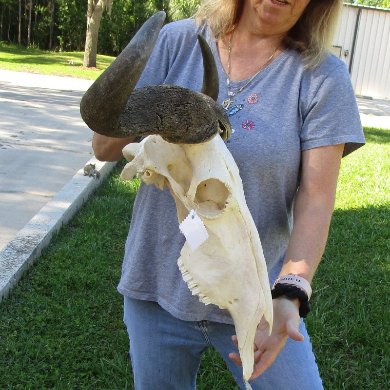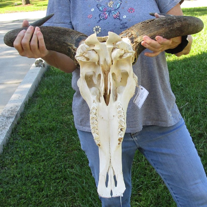 African Blue Wildebeest Skull (Connochaetes gnau) for sale. This blue wildebeest skull with horns has a horn spread of approximately 23 inches wide and the skull is approximately 18 inches long. Small holes in skull and some teeth missing. - Review all photos. This is a real blue wildebeest skull with horns and will have imperfections caused by the animal living in the wild and fighting, such as cracks, holes, blemishes, rub areas, broken or missing teeth, etc. All of our wildebeest skulls with horns are by-products of the African Government's culling program and farming industry. All products were professionally cleaned in South Africa and cleared by the U.S Fish and Wildlife Services and U.S. Customs Services for legal entry into the United States.