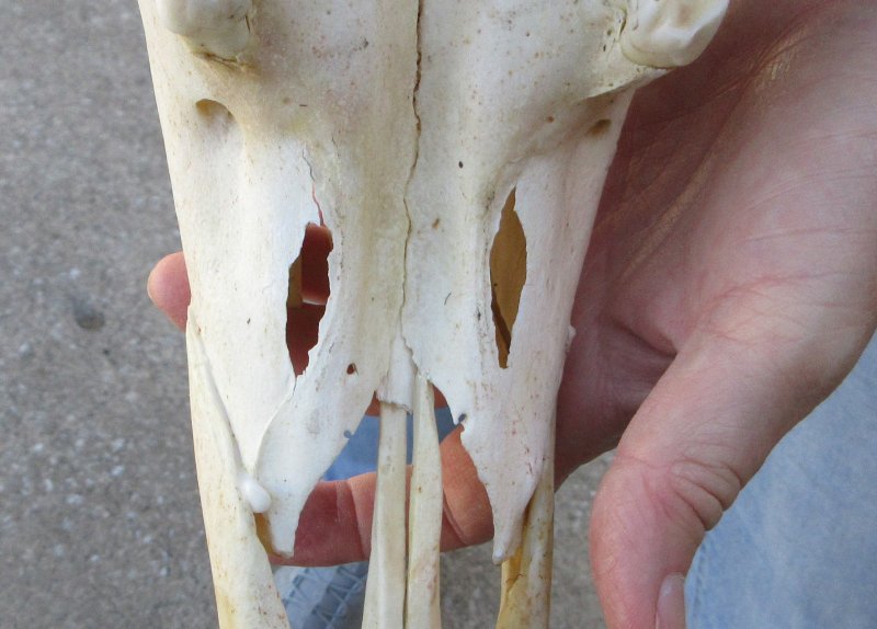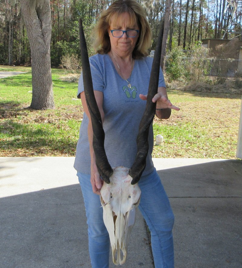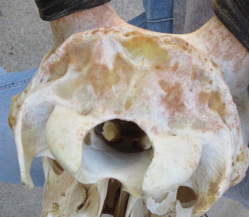African Female Eland (Taurotragus oryx) skull and horns for cabin decor and African themed decor. The horns measure approximately 31 inches around the curl of the horn with a cloth tape measure, not up and down with a ruler.   Discolored areas - Review all photos. This African eland skull and horns has been professionally cleaned in South Africa and is ready for display as part of your rustic cabin decor. All our eland skull and horns are from wild African eland and will have imperfections normally found on all wild animal skulls and horns. Our African eland animal skulls and horns are obtained from the farming industry and the African government. All products have been cleared by the U. S. Fish and Wildlife Services and U.S. Customs Services for legal entry into the United States.