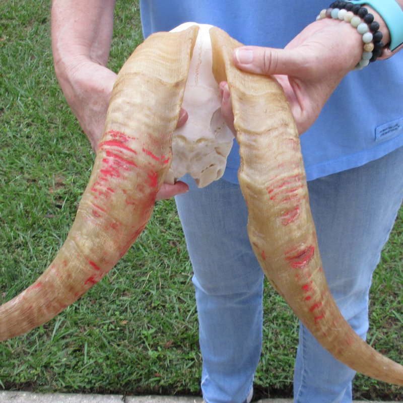 African Domesticated Goat Skull with approximately 17-1/2 inch horns (measured around the curve of the horn with a cloth tape measure) and an estimated 9 x 5 inch long skull.   Red paint on both of the horns. - Review all photos. This is a domesticated African goat and will have imperfections due to the natural aging process and fighting and living -- scars, blemishes, rub areas, broken teeth, etc. All our goat skulls with horns are by-products of the African Government's culling program and farming industry. All products were professional cleaned and/or professionally tanned in South Africa and cleared by the U. S. Fish and Wildlife Services and U.S. Customs Services for legal entry into the United States.
