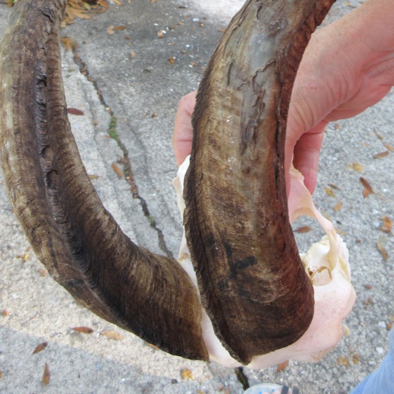 African Domesticated Goat Skull with approximately 18 inch horns (measured around the curve of the horn with a cloth tape measure) and an estimated 10-1/4 inch long skull. Gouges on horns. - Review all photos. This is a domesticated African goat and will have imperfections due to the natural aging process and fighting and living -- scars, blemishes, rub areas, broken teeth, etc. All our goat skulls with horns are by-products of the African Government's culling program and farming industry. All products were professional cleaned and/or professionally tanned in South Africa and cleared by the U. S. Fish and Wildlife Services and U.S. Customs Services for legal entry into the United States.