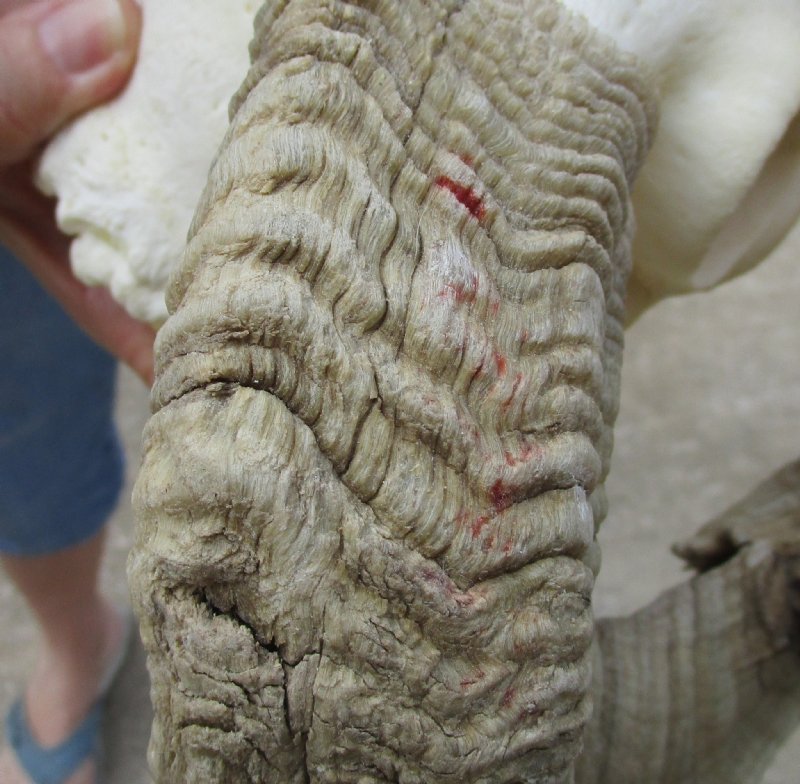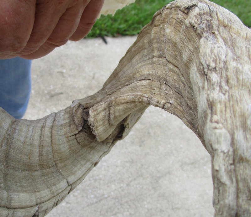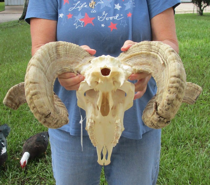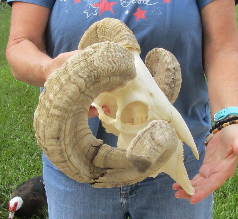 African Merino sheep skull and horns, or ram skull and horns (Ovis aries). The sheep horns measure approximately 26 and 28 inches, measured around the curl of the horns. Sheep Skull measures approximately 11 inches long.  - Horn damage - Review all photos. Horns come off and may be loose. This sheep skull and horns is ready for display and would be perfect for rustic cabin d©cor or log cabin decor. This sheep skull and horns, or ram skull and horns was imported from Africa and cleared for legal entry into the U.S. by the U.S. Fish and Wildlife Department and U.S. Customs Department.