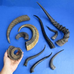Animal horns for sale and animal antlers for sale, hand selected and photographed priced slightly above wholesale for log cabin decor, crafts and making shofars. We carry kudu horns, sheep/ram horns, nyala horns and goat horns for making shofars, and gemsbok horns, Indian cow horns, water buffalo horns, male and female springbok horns, African impala horns, blesbok horns, polished water buffalo horns, polished kudu horns, nyala horns, wildebeest horns, fallow deer antlers and eland horns for taxidermy crafts. Animal horns and antlers can be used for making antler lamps, antler chandeliers, knife handles, cane handles and in numerous other crafts.