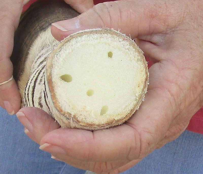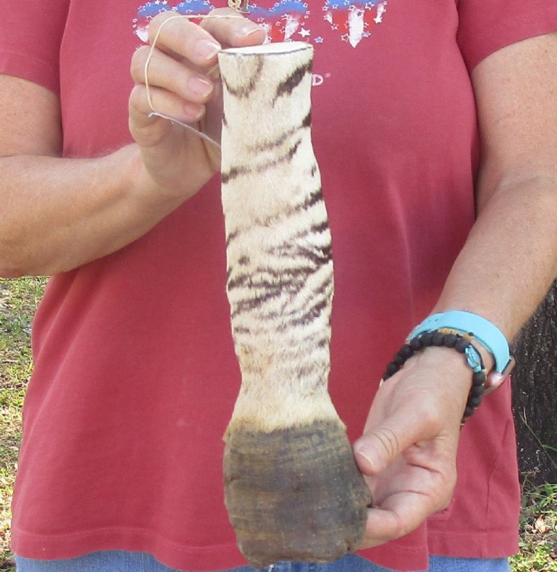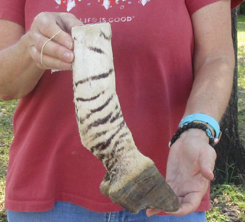 African Zebra Foot Mount (Equus burchelli) for sale, measuring approximately 10 inches tall. This zebra foot mount was professionally tanned and mounted by a South African taxidermist. -  Does not stand on its own. There is visible stitching on the backs of these foot mounts.  Review all photos. The zebra feet are from wild African zebra and will have natural imperfections (bald spots, wear on hoofs, etc.) that are found on all wild animal feet. The Zebra was obtained from the African Government's culling programs and was cleared for legal entry into the U.S. by the U.S. Fish and Wildlife Service and U.S. Customs.