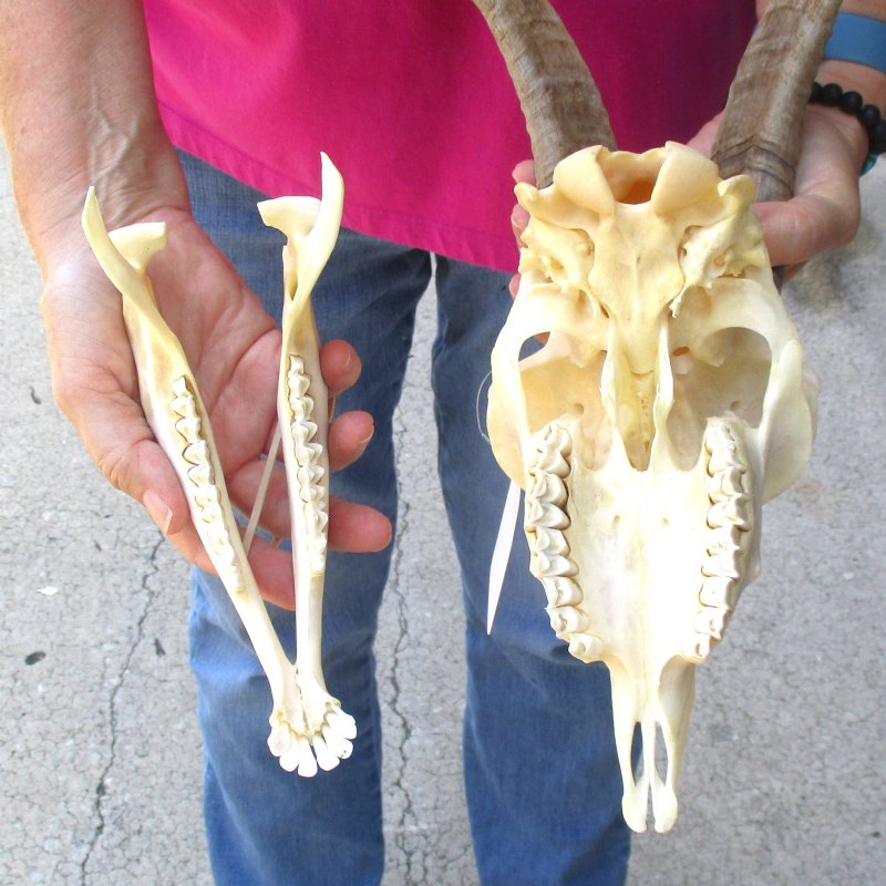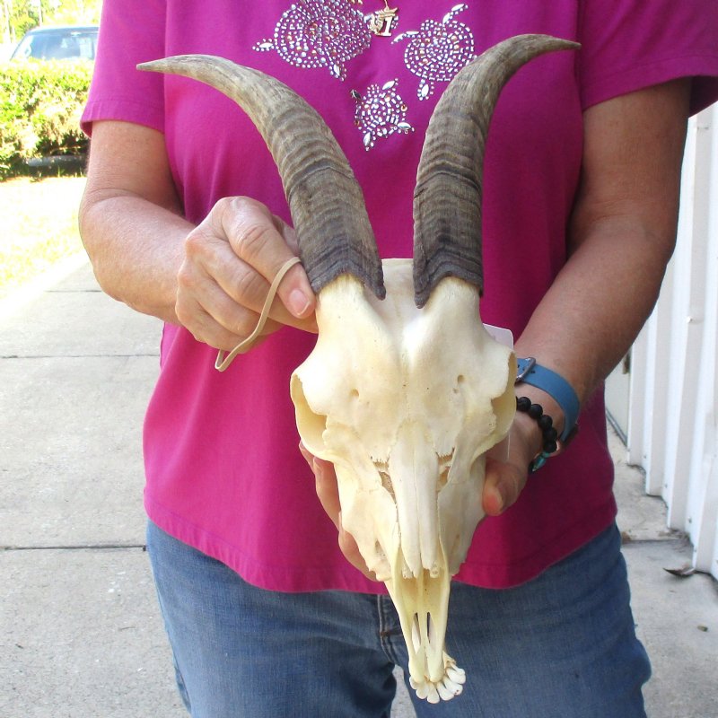 Domestic Goat skull with mandible for sale, horns measuring approximately 9-1/2 inches (measured around the curve of the horn with a cloth tape measure. The skull is approximately 9-1/4 inches long.  -  Review photos. Our goat skulls are a by-product of the North American farming industry.  The goat skull and horns have been professionally cleaned and are ready for display.