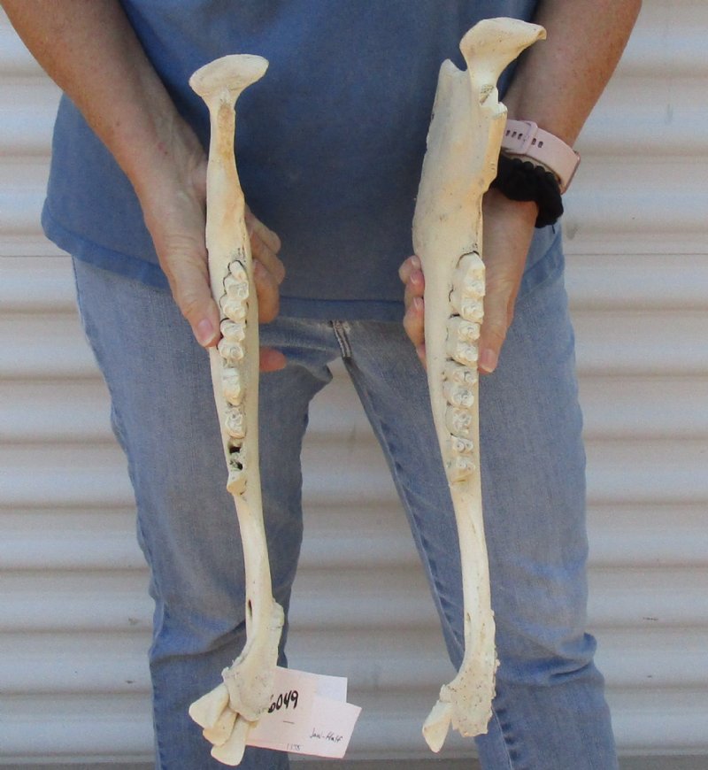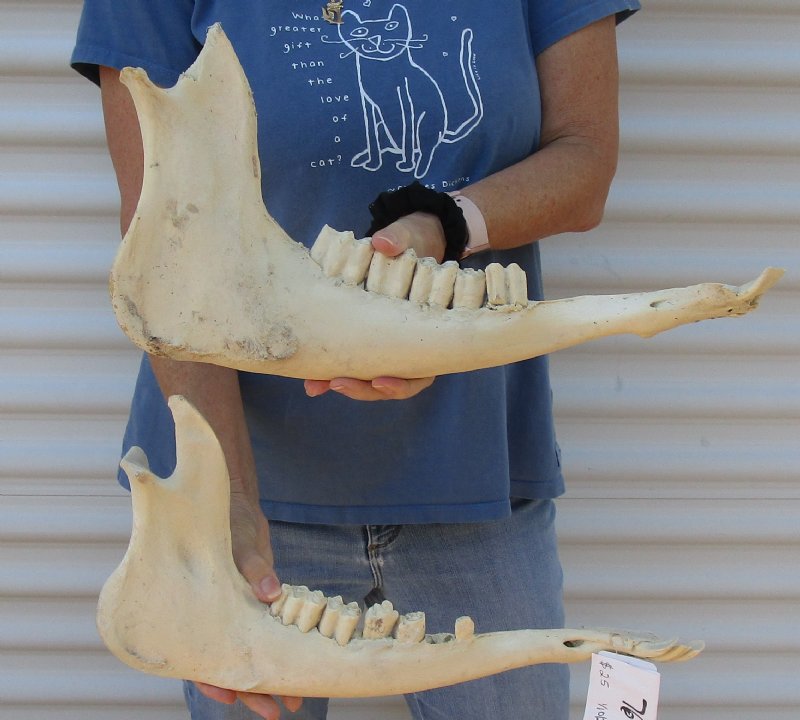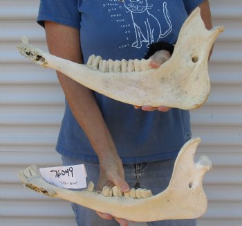 This is a two (2) piece lot of Water Buffalo lower jaw (half pieces) (Bubalus bubalis) bones measuring approximately 17-18 inches long. These Water Buffalo lower jaw bones were cleaned and whitened and imported from India. These are 2 separate jaw bone pieces, not from the same jaw and they are same sided - Review all photos. Buffalo bones are used for carving, scrimshaw art,  and for numerous other craft projects.