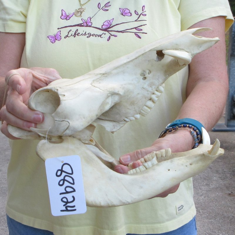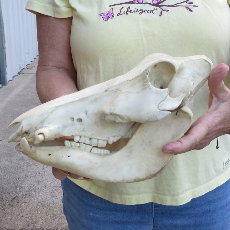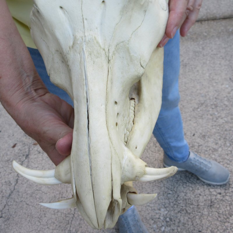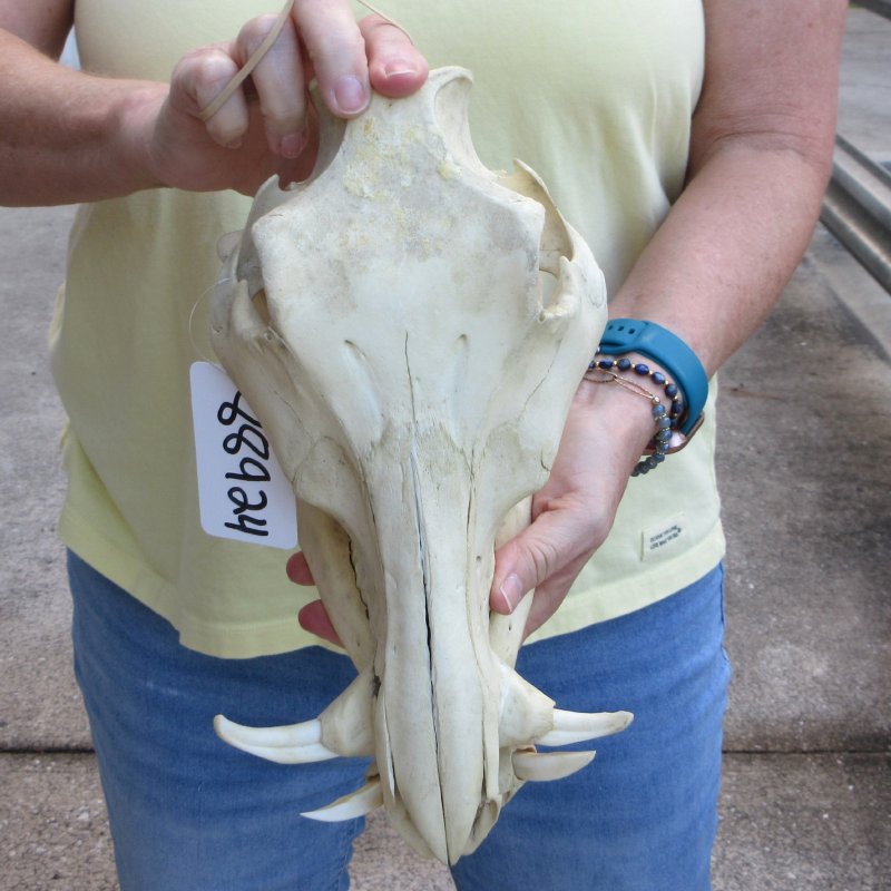 B-Grade, African Warthog Skull (Phacochoerus aethiopicus) for sale measuring approximately 11 inches in length. The top ivory tusks measure approximately 3 inches long, around the curve of the horns - not straight with a wood ruler. - Damage to nose area, missing teeth, holes, build up, cracks, and discoloration to skull throughout. Review all photos. This skull was harvested in South Africa and cleared for entry into the United States by the U.S. Department of Fish and Wildlife and U.S. Customs. This warthog skull with ivory tusks is from a wild African warthog and may have missing teeth, worn tusk, chipped bones, cuts, scratches, blemishes, tiny holes and scars or have natural imperfections from the animal living in the wild.