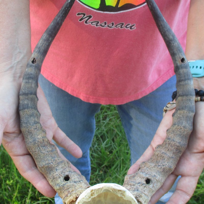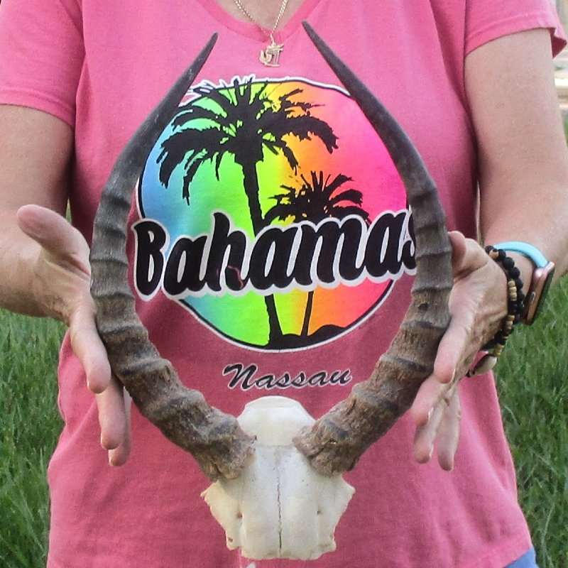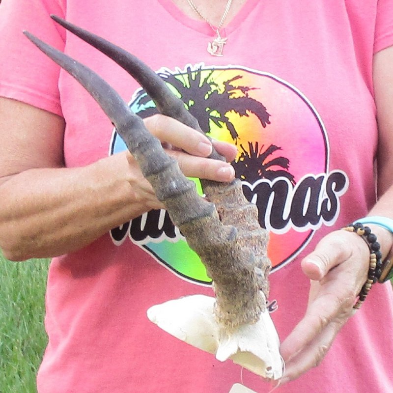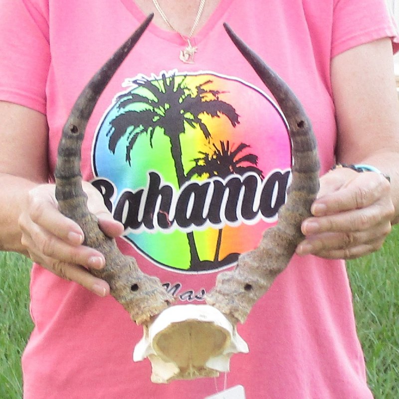 B-Grade African Impala skull plate and horns for sale (Aeryceros melampus) for rustic cabin decor and African themed decorating.  The horns measure approximately 14 inches measured around the curve of the horns with a cloth tape measure, not straight up and down with a ruler.   Rough horns and drill holes. Review all photos carefully as this is the one you are buying.   This skull plate and horns is from a wild African Impala and will have imperfections normally found on all wild Impalas from living in the wild, aging and fighting.