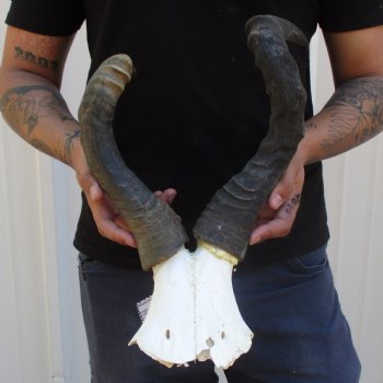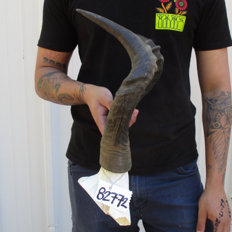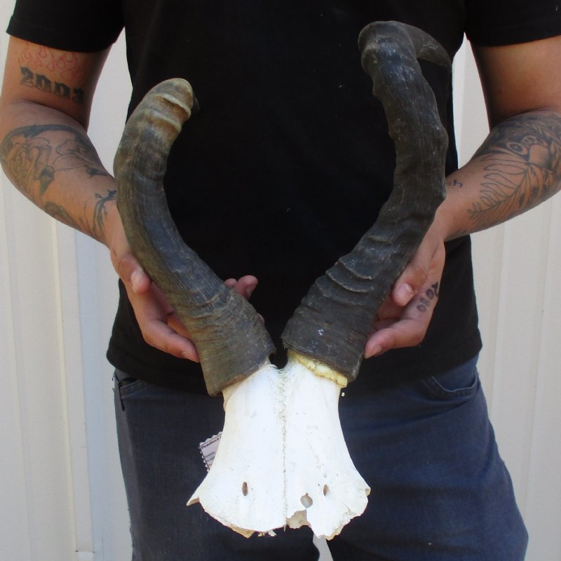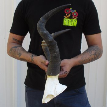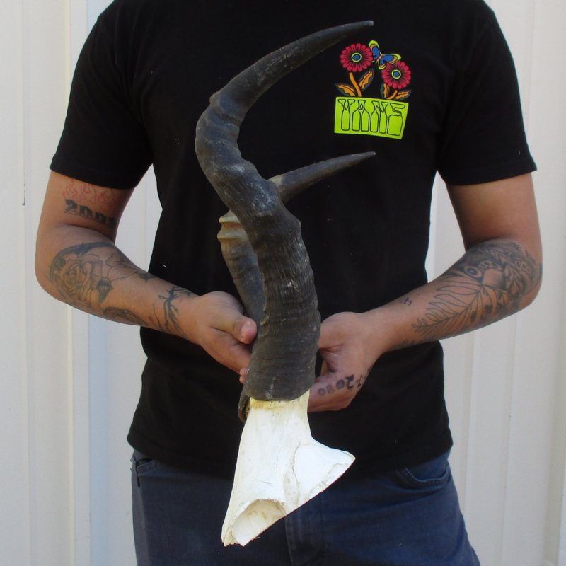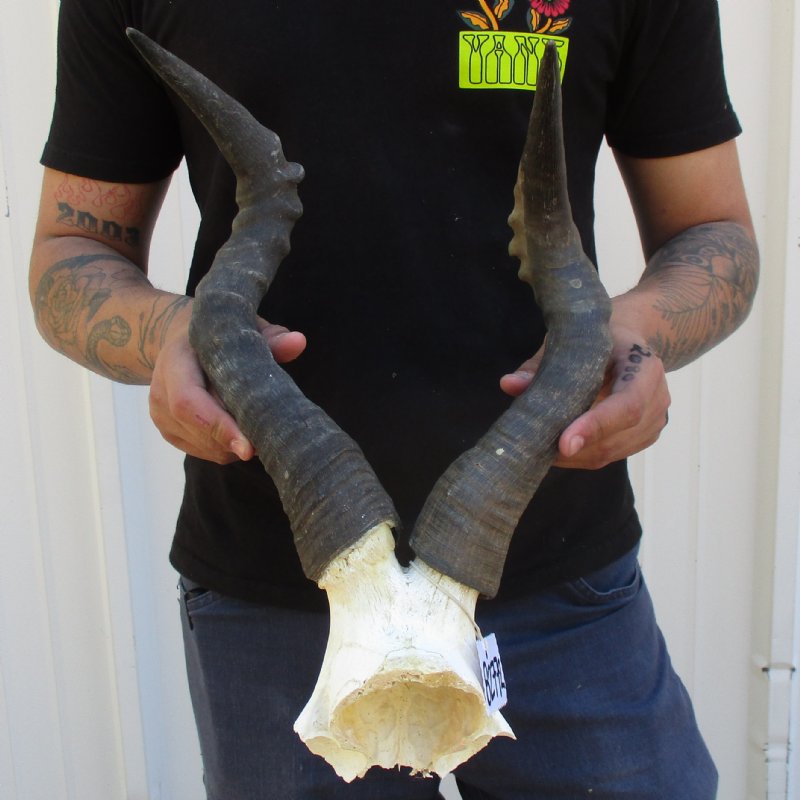 B-Grade African Female Red Hartebeest Skull Plate (Alcelaphus buselaphus) with horns for sale. The horns measure approximately 16 inches, around the curve of the horn -- not straight. - One horn doesn't fit all the way on skull plate. Review all photos. This red hartebeest skull plate and horns are from a wild African Red Hartebeest and will have natural imperfections found on all wild animals fighting and living in the wild. All our red hartebeest skull and horns have been imported from South Africa and cleared for legal entry into the U.S. by the U.S. Fish & Wildlife Service and U.S. Customs.
