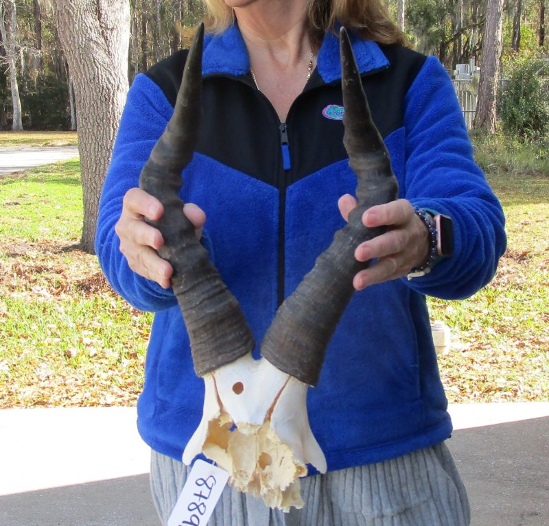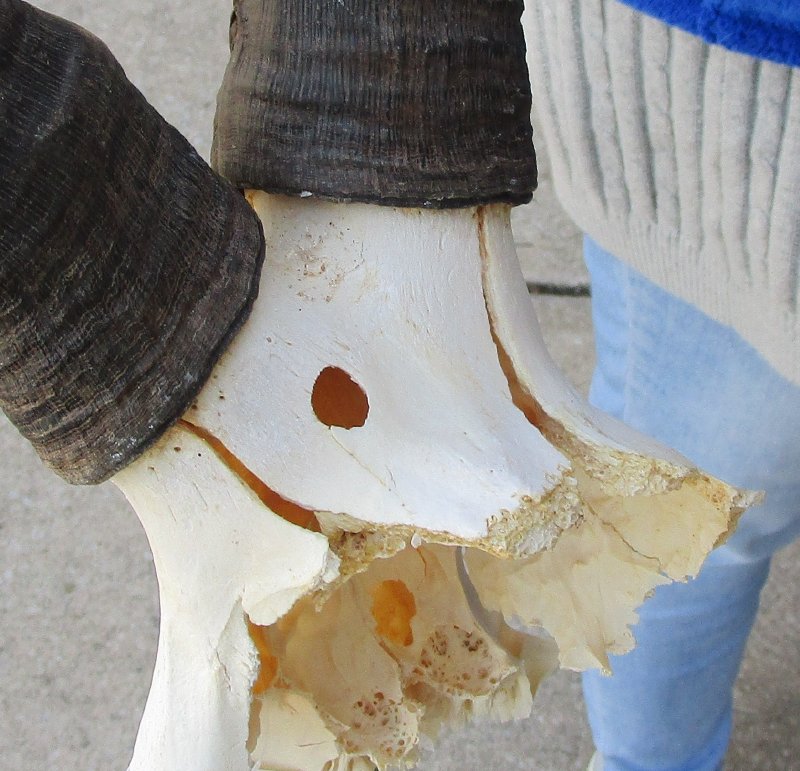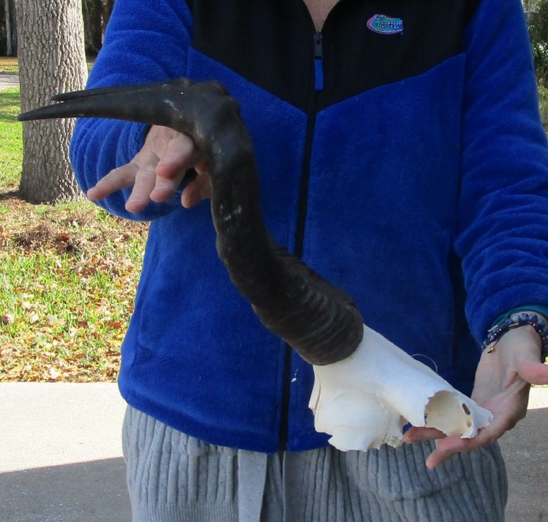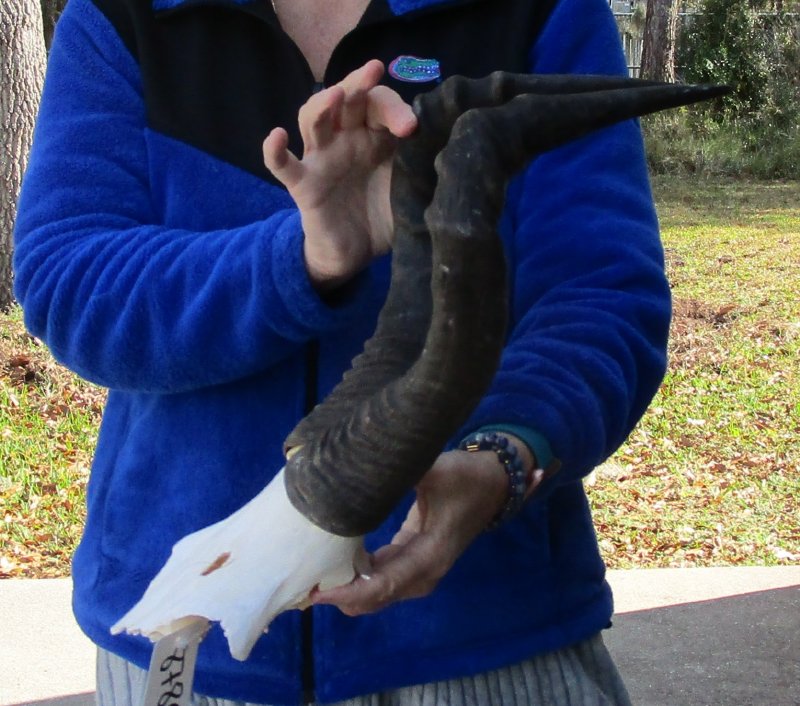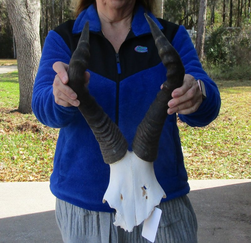 B-Grade African Female Red Hartebeest Skull Plate (Alcelaphus buselaphus) with horns for sale. The horns measure approximately 16 inches, around the curve of the horn -- not straight. - Cracks and holes on back of skull plate. Review all photos. This red hartebeest skull plate and horns are from a wild African Red Hartebeest and will have natural imperfections found on all wild animals fighting and living in the wild. All our red hartebeest skull and horns have been imported from South Africa and cleared for legal entry into the U.S. by the U.S. Fish & Wildlife Service and U.S. Customs.