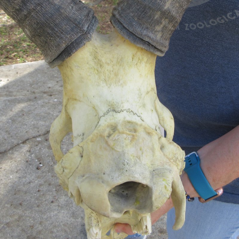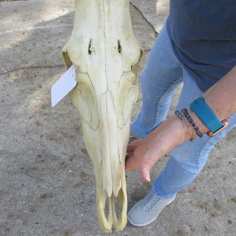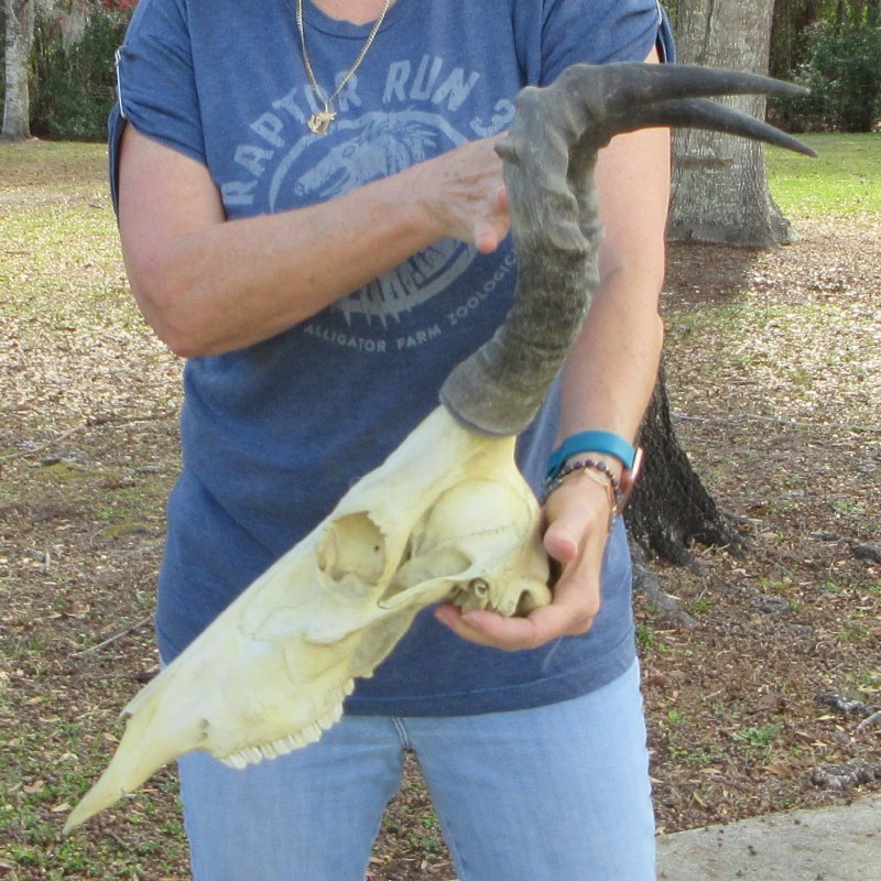 African B-Grade Red Hartebeest (male) Skull (Alcelaphus buselaphus) with horns for sale. The horns measure approximately 17 inches, around the curve of the horn -- not straight. - Glue repair, discoloration, , missing teeth, and cracks.  - Review all photos. This red hartebeest skull plate and horns are from a wild African Red Hartebeest and will have natural imperfections found on all wild animals fighting and living in the wild. All our red hartebeest skull and horns have been imported from South Africa and cleared for legal entry into the U.S. by the U.S. Fish & Wildlife Service and U.S. Customs.