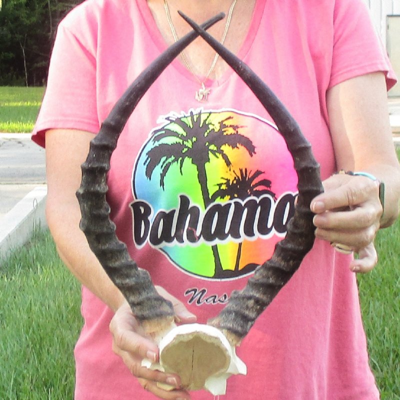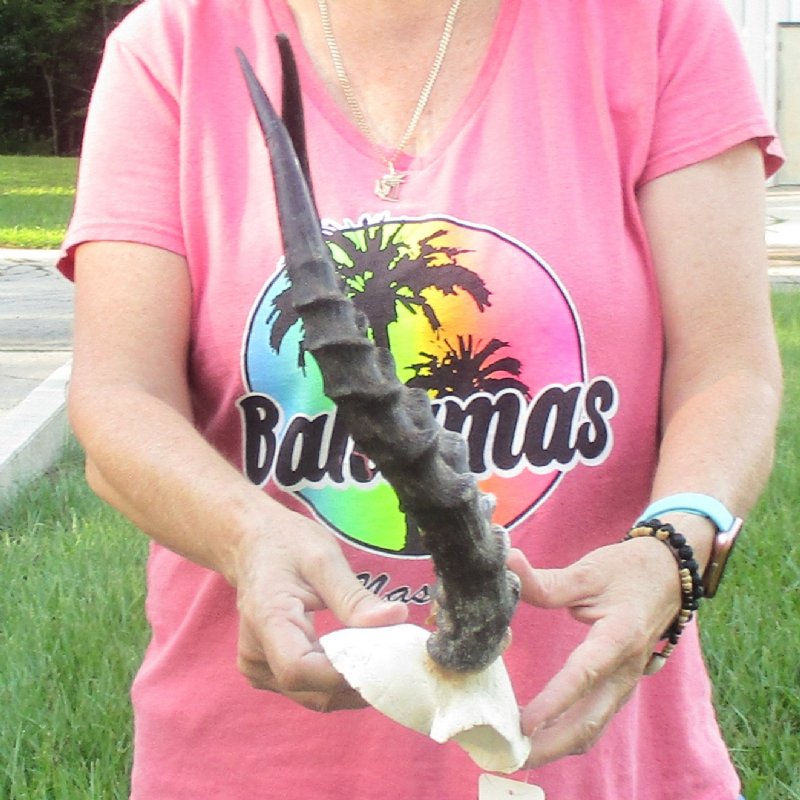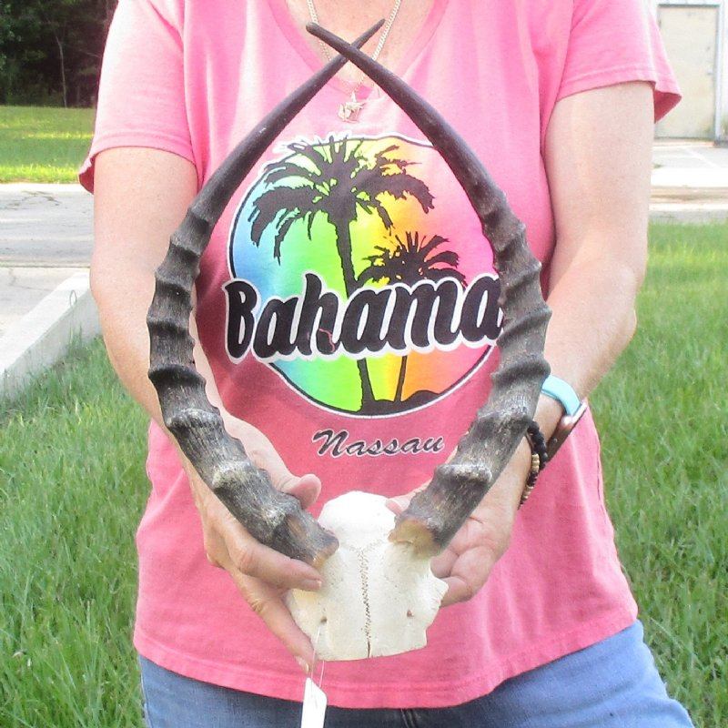 B-Grade African Impala skull plate and horns for sale (Aeryceros melampus) for rustic cabin decor and African themed decorating.  The horns measure approximately 17 inches measured around the curve of the horns with a cloth tape measure, not straight up and down with a ruler.   Rough horns. Review all photos carefully as this is the one you are buying.   This skull plate and horns is from a wild African Impala and will have imperfections normally found on all wild Impalas from living in the wild, aging and fighting.
