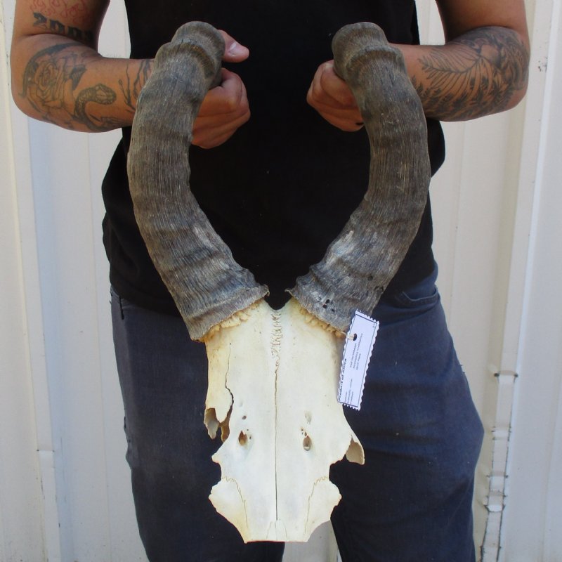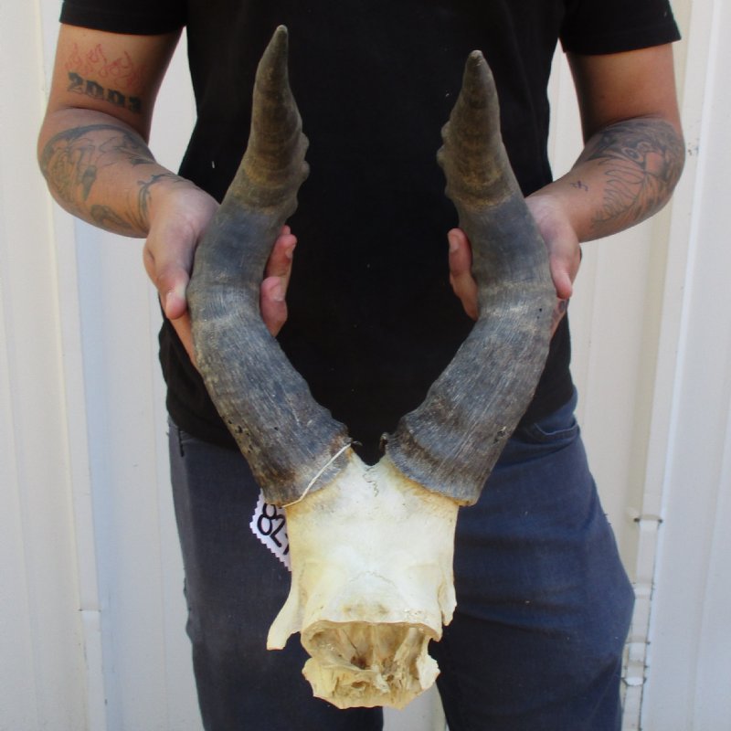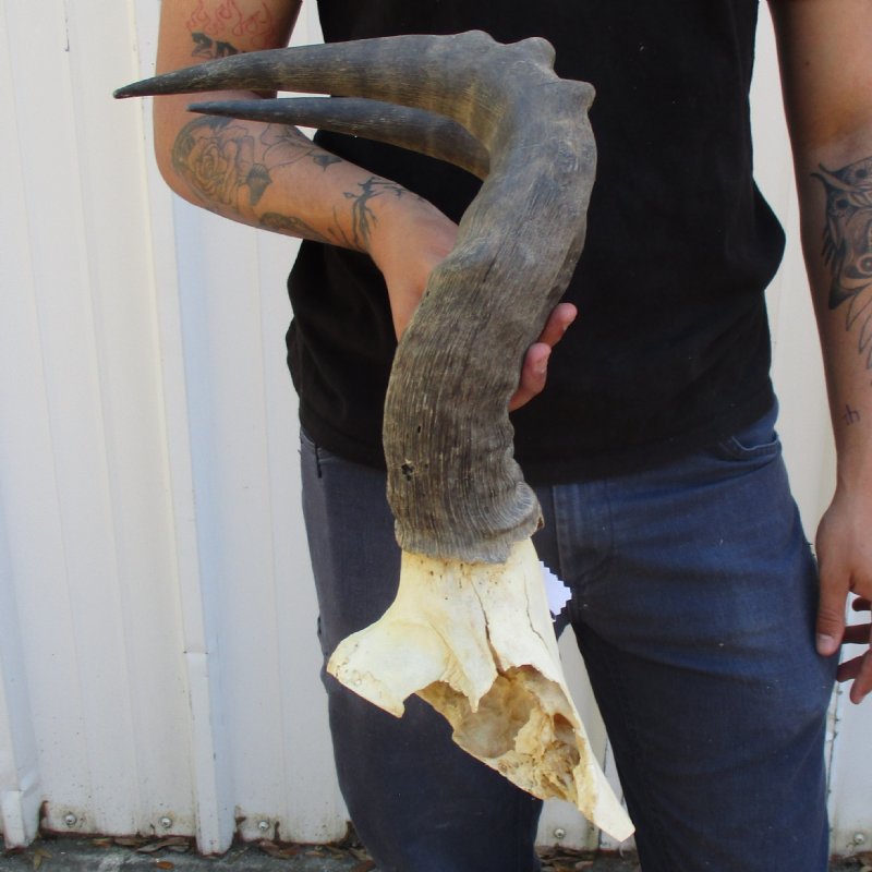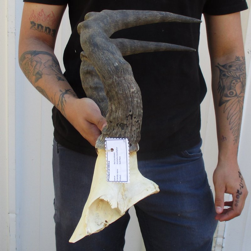 B-Grade African Male Red Hartebeest Skull Plate (Alcelaphus buselaphus) with horns for sale. The horns measure approximately 19 inches, around the curve of the horn -- not straight. - Crack in skull plate and weathered horns; worm holes in horns. Review all photos. This red hartebeest skull plate and horns are from a wild African Red Hartebeest and will have natural imperfections found on all wild animals fighting and living in the wild. All our red hartebeest skull and horns have been imported from South Africa and cleared for legal entry into the U.S. by the U.S. Fish & Wildlife Service and U.S. Customs.
