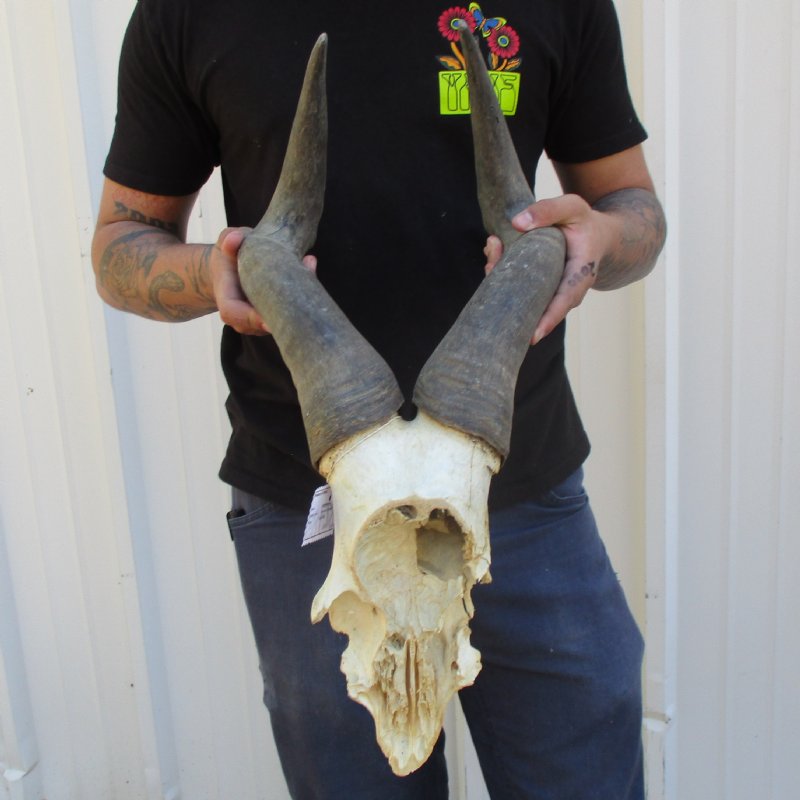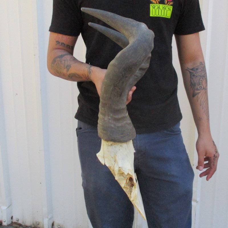 B-Grade African Male Red Hartebeest Skull Plate (Alcelaphus buselaphus) with horns for sale. The horns measure approximately 19 inches, around the curve of the horn -- not straight. - Crack in skull plate. Review all photos. This red hartebeest skull plate and horns are from a wild African Red Hartebeest and will have natural imperfections found on all wild animals fighting and living in the wild. All our red hartebeest skull and horns have been imported from South Africa and cleared for legal entry into the U.S. by the U.S. Fish & Wildlife Service and U.S. Customs.