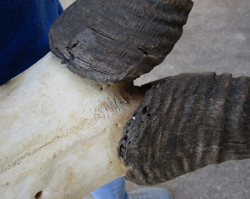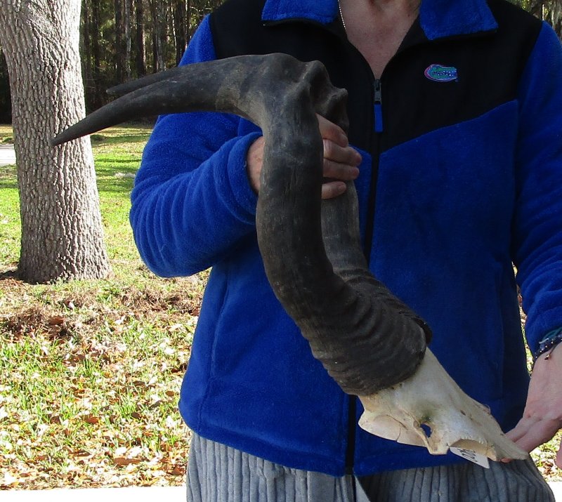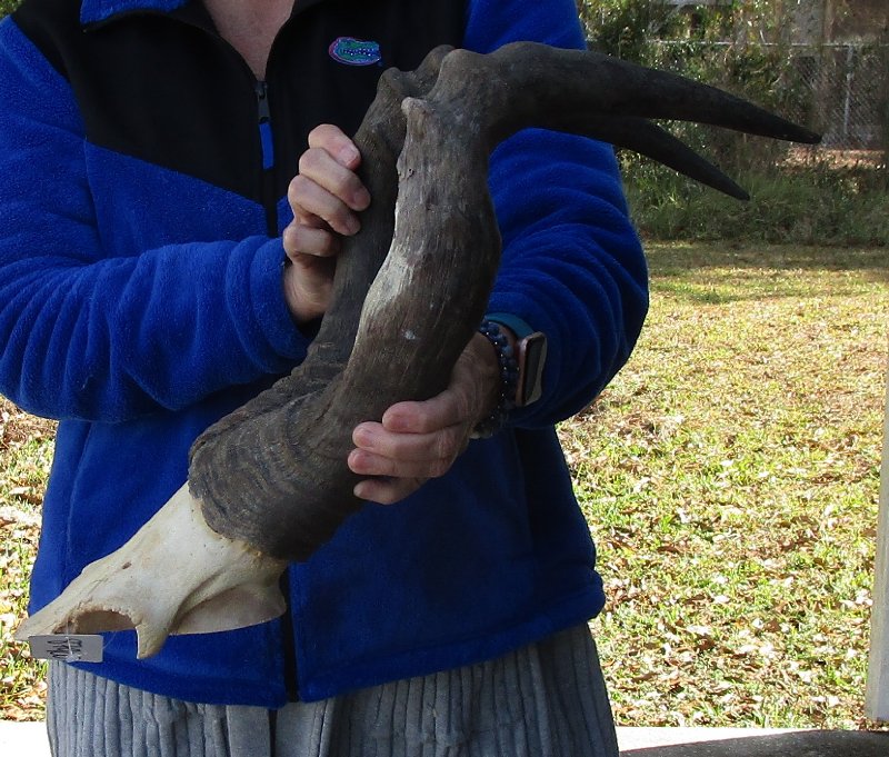 B-Grade African Male Red Hartebeest Skull Plate (Alcelaphus buselaphus) with horns for sale. The horns measure approximately 22 inches, around the curve of the horn -- not straight. - Worm holes/damage on horns and skull plate. Review all photos. This red hartebeest skull plate and horns are from a wild African Red Hartebeest and will have natural imperfections found on all wild animals fighting and living in the wild. All our red hartebeest skull and horns have been imported from South Africa and cleared for legal entry into the U.S. by the U.S. Fish & Wildlife Service and U.S. Customs.