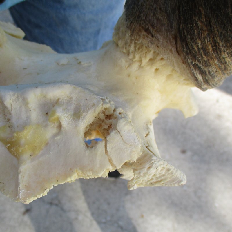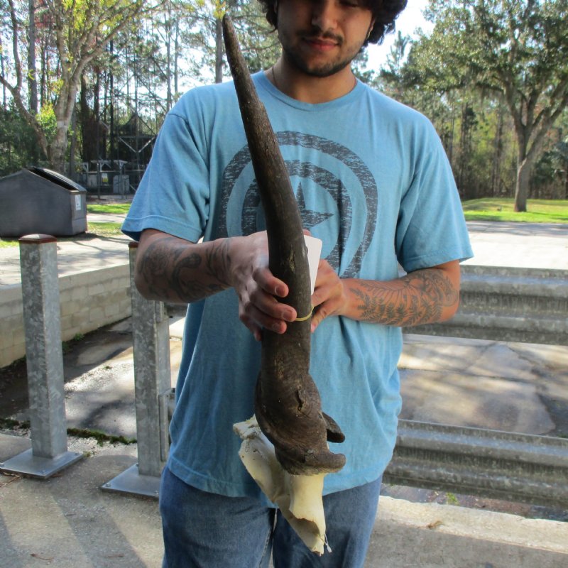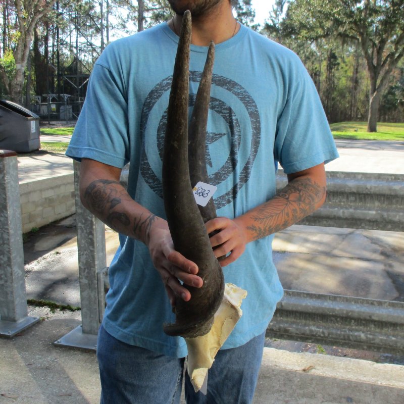 B-Grade Male Eland Skull Plate (Taurotragus oryx) with horns measuring approximately 29 & 30 inches long, for sale. This is a real eland skull plate with horns and will have some imperfections resulting from the natural aging process and living in the wild. - Hole in skull plate and some damage to horns. Review all photos. This Eland skull plate was imported from South Africa and obtained from the African government's culling program and the farming industry. We are direct importers of African animal skulls and horns and animal products.