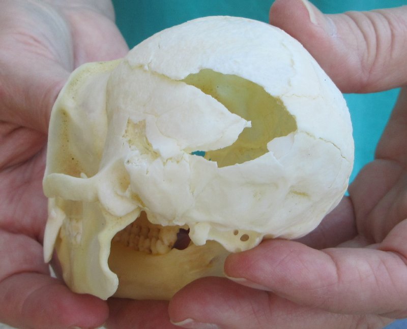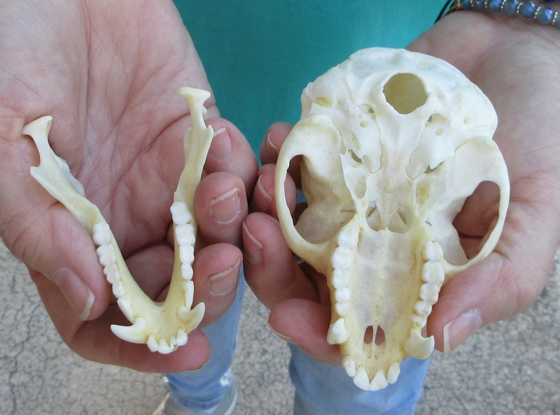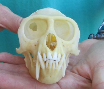 B-Grade Male African Vervet Monkey Skull (Chlorocebus pygerythrus) for salemeasuring approximately 4 inches long and 2-1/2 inches wide. - Hole in back of skull - Review all photos.  All of our monkey skulls are commercial grade and imperfect. They will have imperfections due to the natural aging process and living in the wild--scars, blemishes, rub areas, broken or missing teeth, bug bite marks, etc. This vervet monkey skull was professionally cleaned and cleared by the U.S Fish and Wildlife Services and U.S Customs Services for legal entry into the United States. These were obtained from the African Government's Culling Program.
