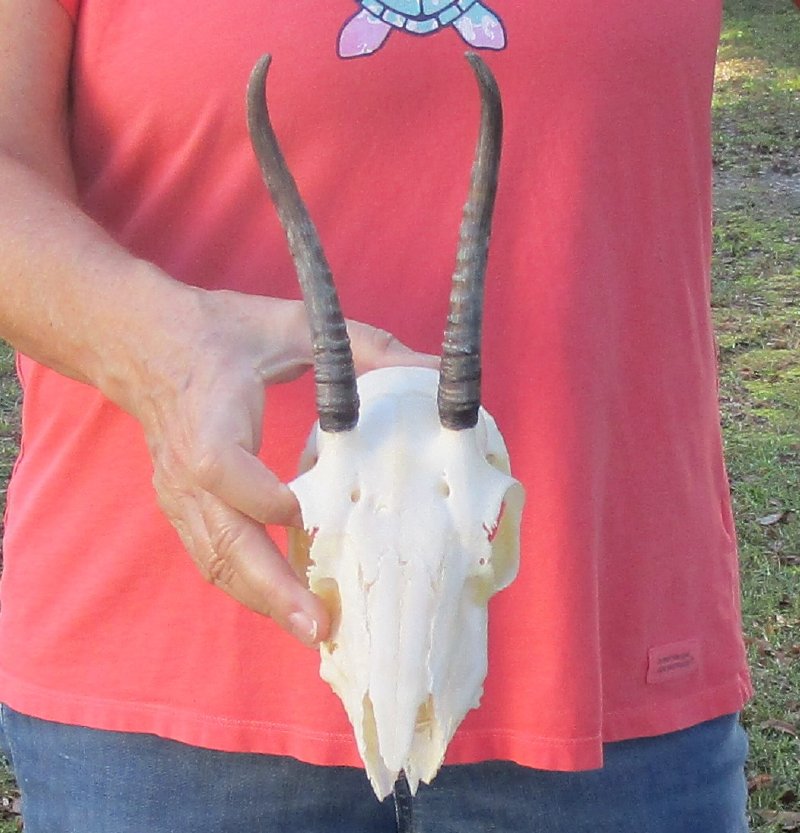 B-Grade Female Springbok Skull (Antidorcas marsupialis) for sale with horns measuring approximately 5 1/2 inches, measured around the curl of the horns and skull approximately 7 inches.  Damage to nose area and missing teeth - Review all photos. This springbok skull and horns is from a wild African springbok and will have imperfections caused by the animal living in the wild and the natural aging process.