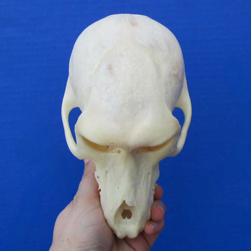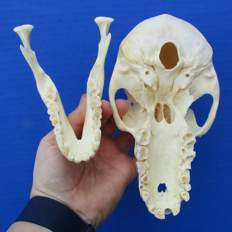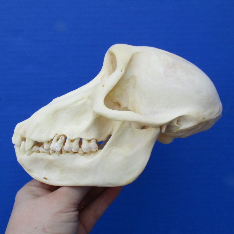 B-Grade Female Chacma Baboon Skull (Papio ursinus) for sale, measuring approximately 6-3/4 inches long and 3-3/4 inches wide. - Some teeth missing. Review all photos. The Chacma Baboon, also known as the Cape Baboon, is, like all other baboons, from the Old World monkey family. It is one of the largest of all monkeys. All of our baboon skulls are commercial grade and imperfect. They will have imperfections due to the natural aging process and living in the wild--scars, blemishes, chipped/broken/missing teeth, etc. This baboon skull was imported from South Africa and was professionally cleaned. It has been cleared by the U.S Fish and Wildlife Services and U.S Customs Services for legal entry into the United States.
