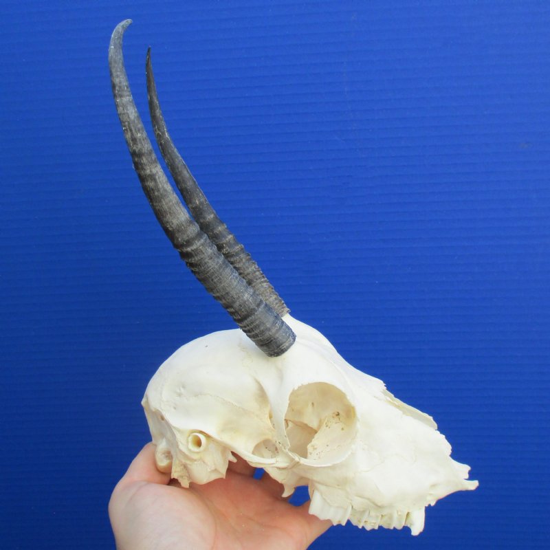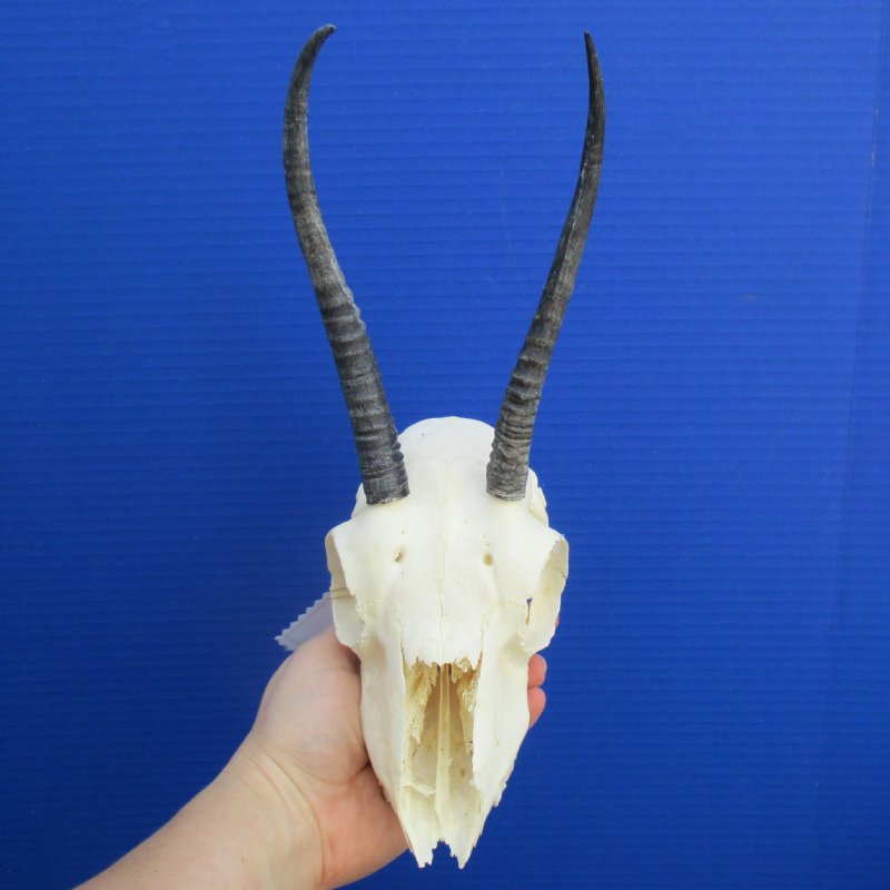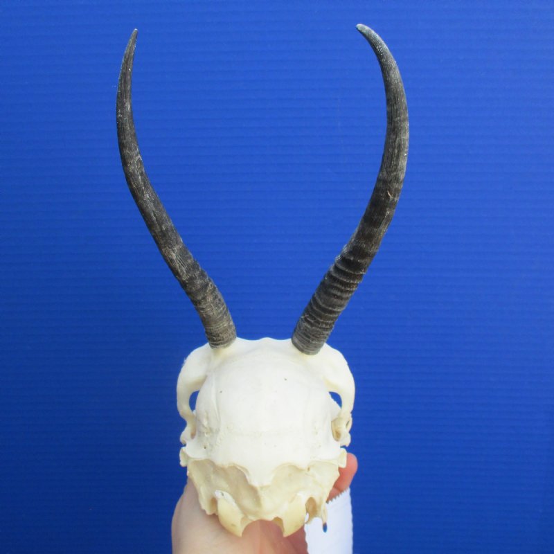 B-Grade Female Springbok Skull (Antidorcas marsupialis) for sale with horns measuring approximately 6 to 7 inches, measured around the curl of the horns. Damage to skull and some teeth missing. - Review all photos. This springbok skull and horns is from a wild African springbok and will have imperfections caused by the animal living in the wild and the natural aging process.