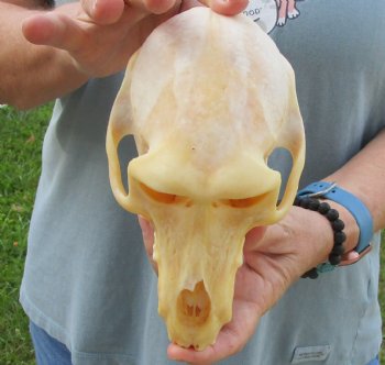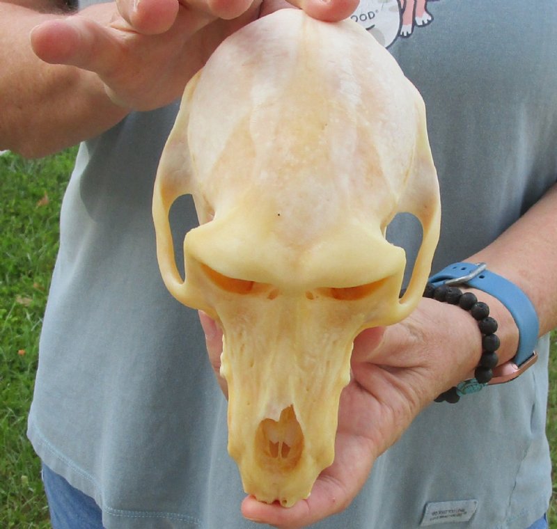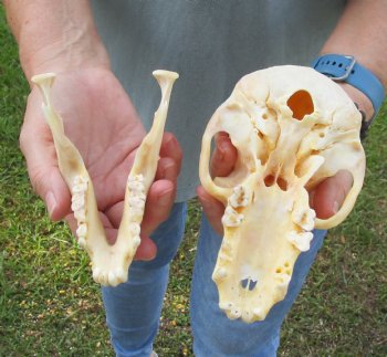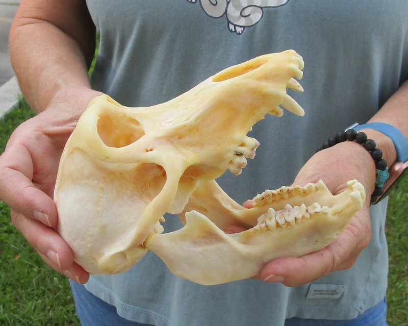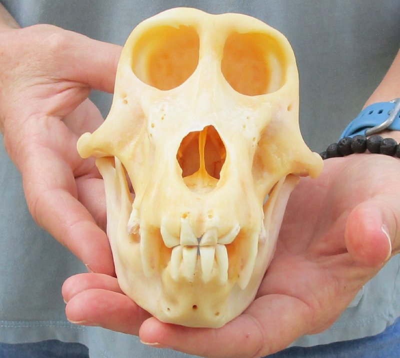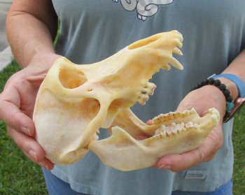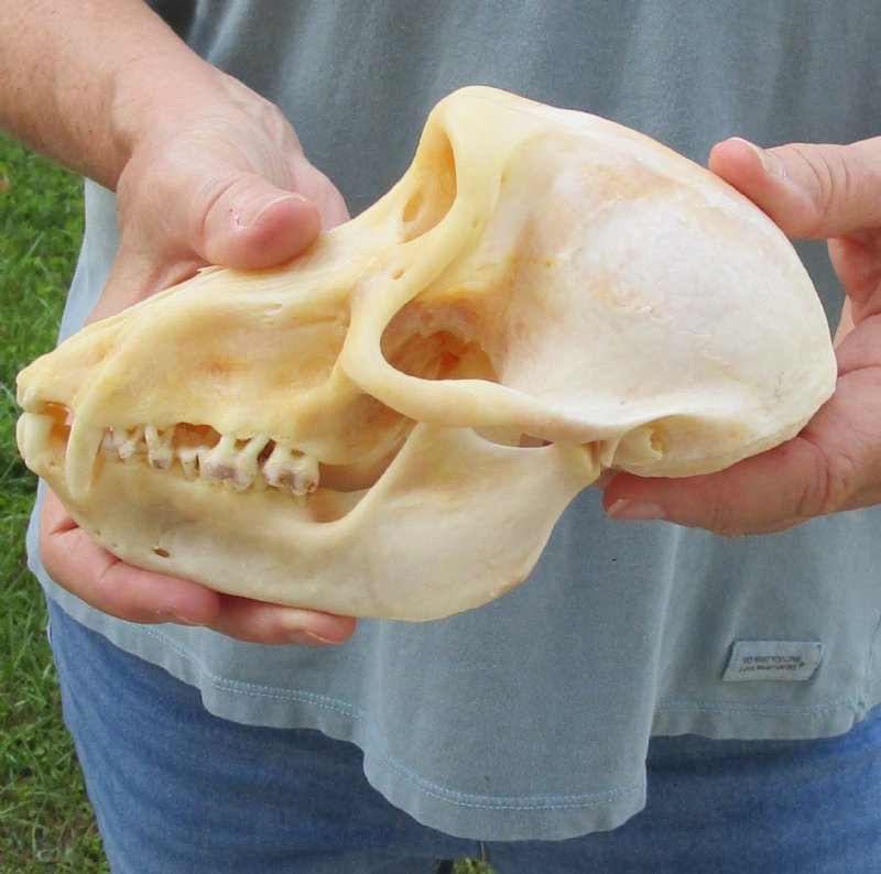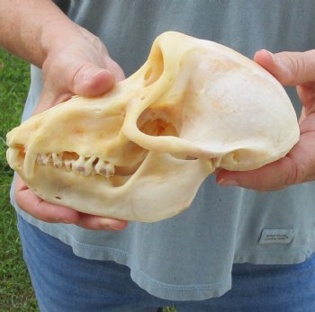 B-Grade Female Chacma Baboon Skull (Papio ursinus) for sale, measuring approximately 7-1/4 inches long and 4 inches wide. Missing some teeth, discoloration - Review all photos. The Chacma Baboon, also known as the Cape Baboon, is, like all other baboons, from the Old World monkey family. It is one of the largest of all monkeys. All of our baboon skulls are commercial grade and imperfect. They will have imperfections due to the natural aging process and living in the wild--scars, blemishes, chipped/broken/missing teeth, etc. This baboon skull was imported from South Africa and was professionally cleaned. It has been cleared by the U.S Fish and Wildlife Services and U.S Customs Services for legal entry into the United States.