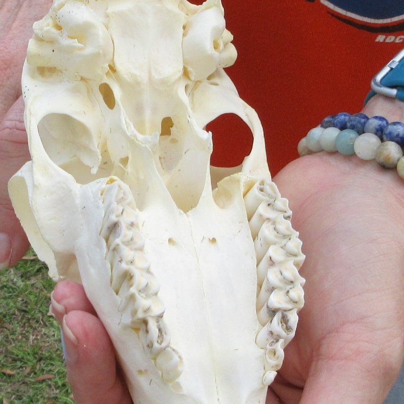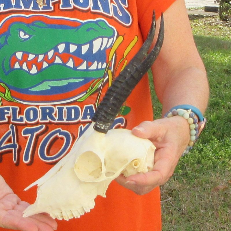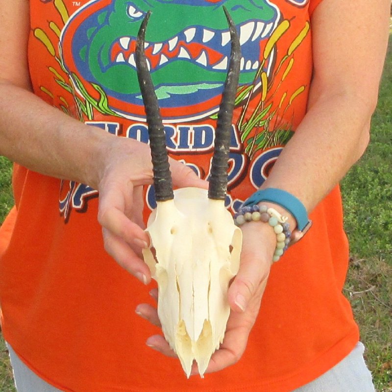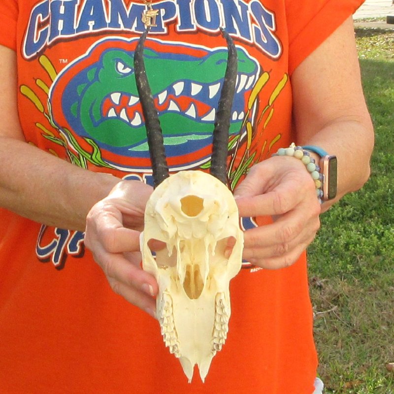 B-Grade Female Springbok Skull (Antidorcas marsupialis) for sale with horns measuring approximately 7 inches, measured around the curl of the horns. Skull measuring approximately 7 inches. Missing part of nose area and mouth, cracks, holes, and teeth missing. - Review all photos. This springbok skull and horns is from a wild African springbok and will have imperfections caused by the animal living in the wild and the natural aging process.