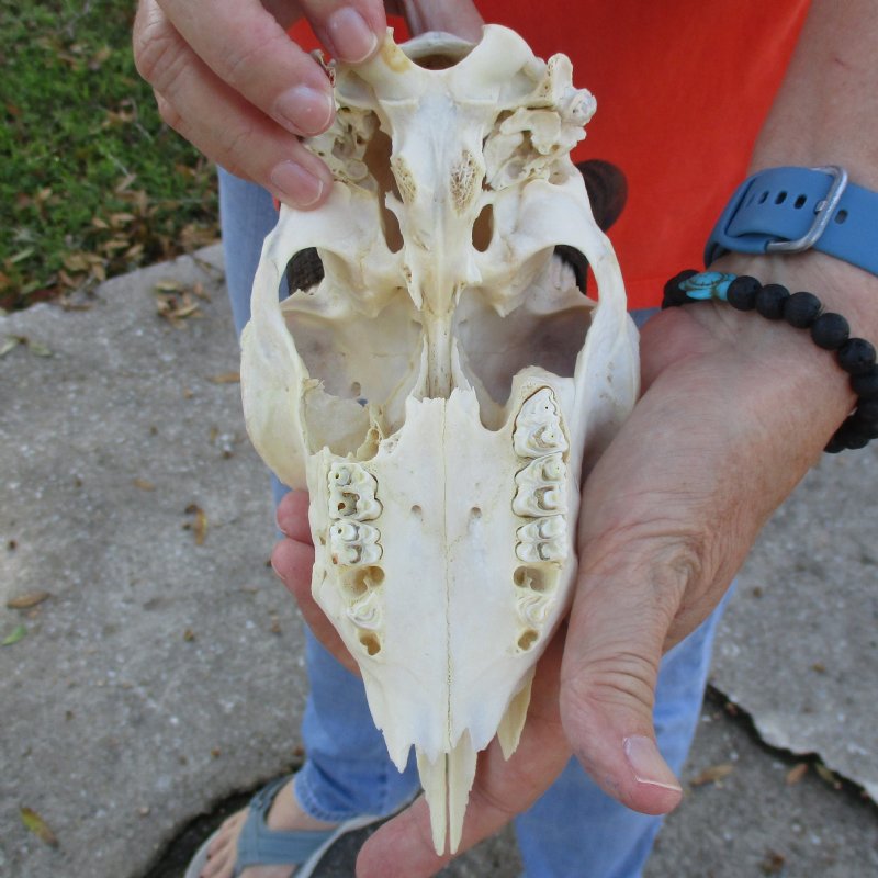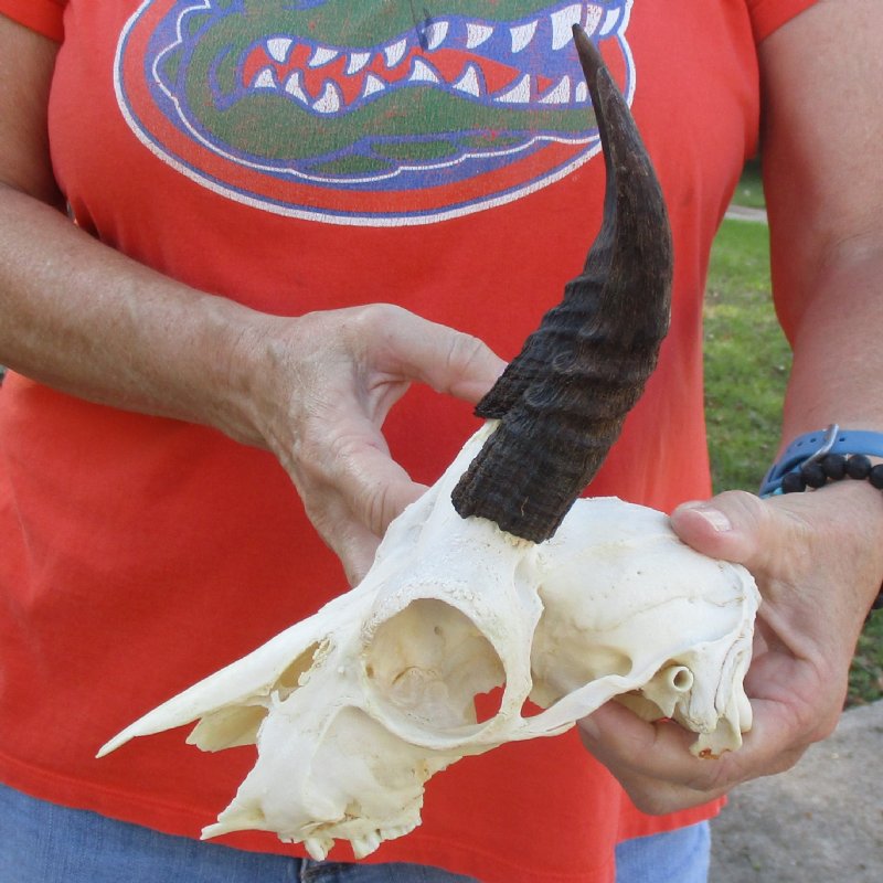 B-Grade Mountain Reedbuck Skull (Redunca fulvorufula) for sale with horns measuring approximately 5-1/2 inches, measured around the curl of the horns. The skull measures approximately 8 inches long. Damage to skull and some teeth missing - Review all photos. This Mountain Reedbuck skull is from a wild African Reedbuck and will have imperfections caused by the animal living in the wild and the natural aging process.