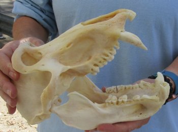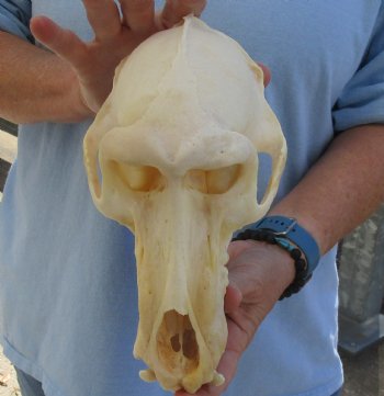 All of our baboon skulls are commercial grade and imperfect.  They will have imperfections due to the natural aging process and living in the wild--scars, blemishes, broken/missing teeth, etc.  This baboon skull was professionally cleaned and cleared by the U.S Fish and Wildlife Services and U.S Customs Services for legal entry into the United States.